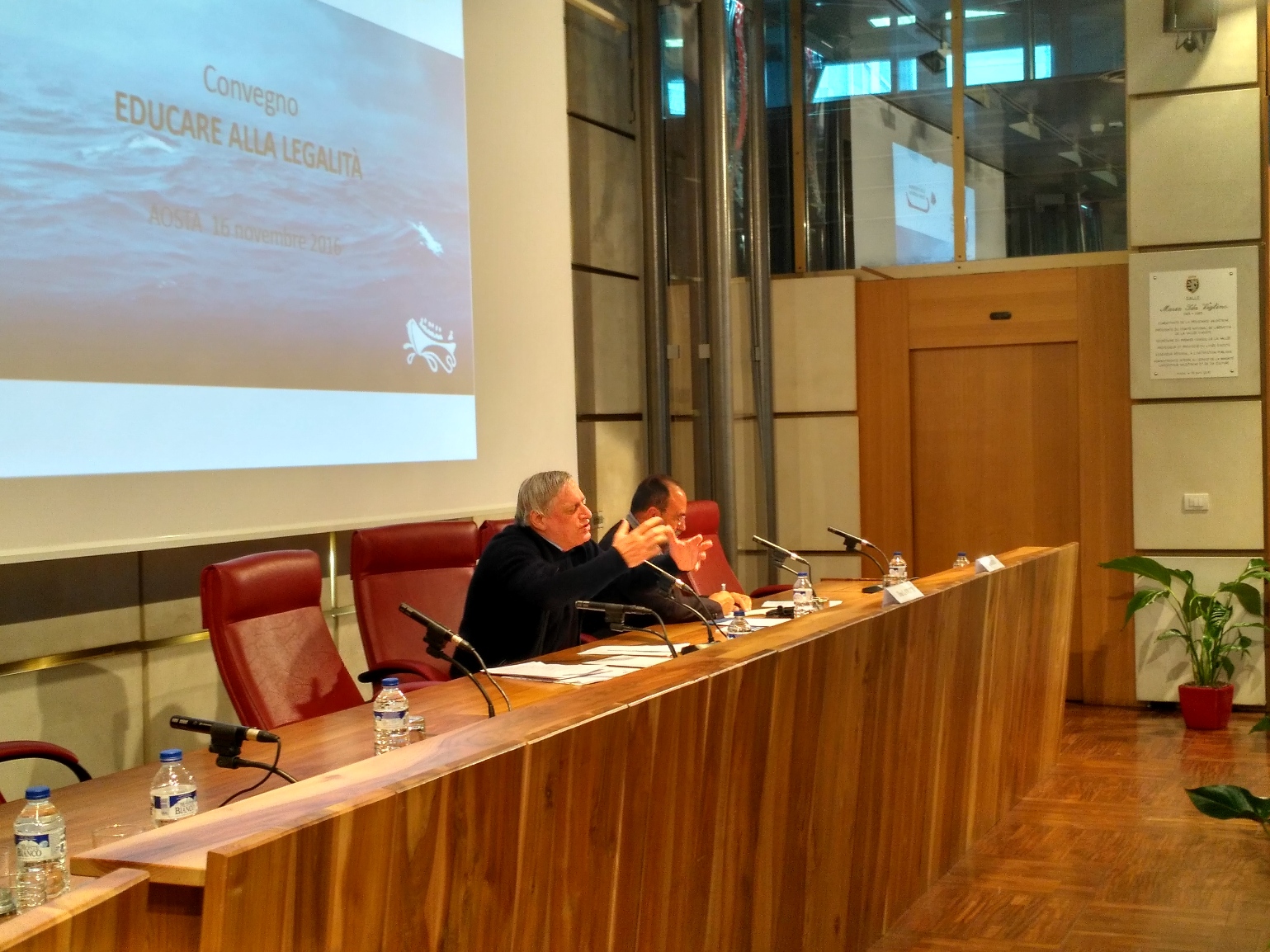 Prima di Luigi Ciotti, sul palco, si erano susseguiti gli interventi di Ernesto Ramojno, presidente della Fondazione "La Scialuppa CRT", promotrice del convegno, e dei rappresentanti delle istituzioni che lo sostengono, il presidente Nicola Rosset per la Chambre Valdôtaine e il presidente Augusto Rollandin e l'assessore Emily Rini, per la Regione.