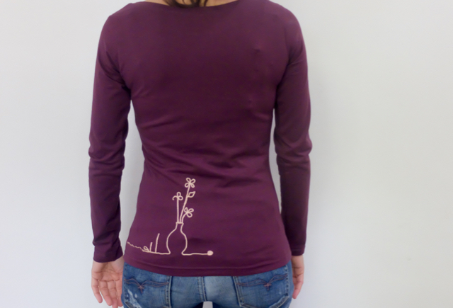 Le magliette a manica lunga sono realizzate in eco-cotone al 95%, e sono disponibili in due colori, bordeaux e blu petrolio, e nelle taglie, solo per donna, dalla S alla XL.