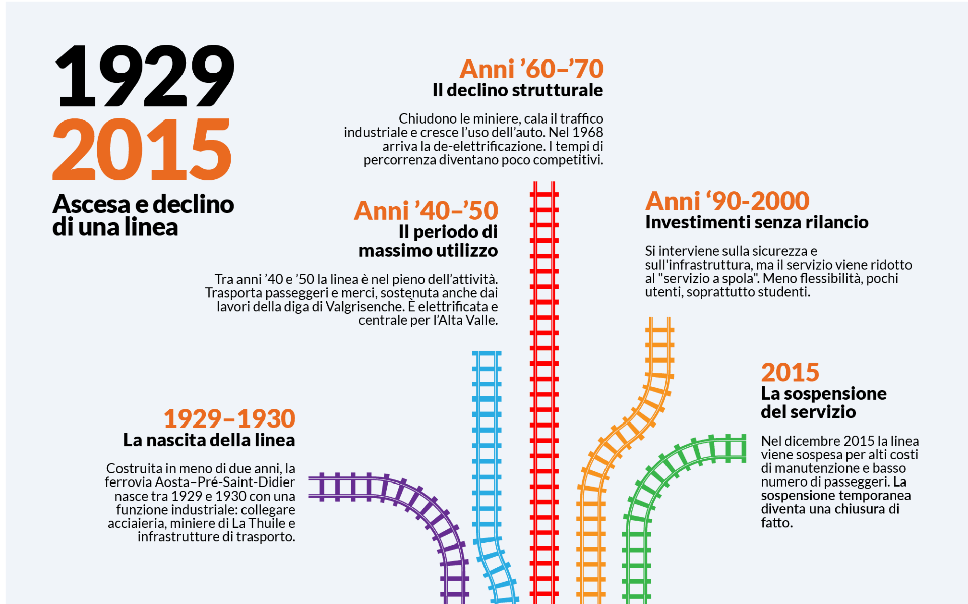 Il passaggio decisivo avviene nel 2015, quando Rete ferroviaria italiana sospende il servizio sulla Aosta–Pré-Saint-Didier. La linea non viene dismessa, ma entra in una fase di sospensione a tempo indeterminato. Il tracciato perde così la sua funzione operativa, pur restando vincolato dal punto di vista normativo. È da questo momento che il tema del riuso dell’infrastruttura inizia a porsi in modo concreto.