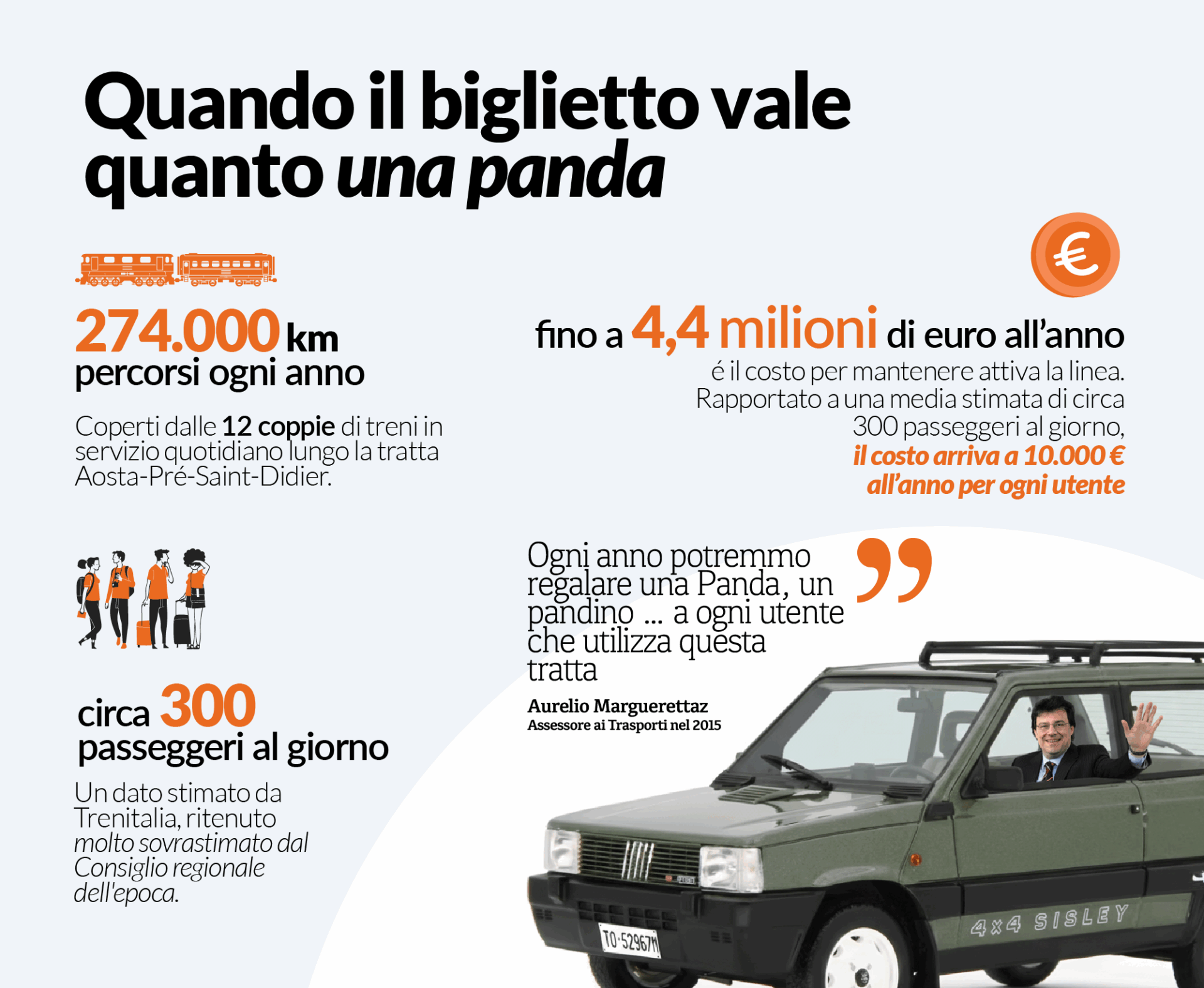 Poi, i numeri: “Avendo mediamente 300 passeggeri al giorno, lo scrive Trenitalia: 300-350 al giorno, e, a seconda della quantificazione, spendendo dai 3 ai 4 milioni, vuol dire che ogni utente costa 10mila euro all’anno”. Ma anche una dichiarazione – più che altro un’iperbole dell’Assessore – rivolta alla consigliera di Alpe, e oggi vicepresidente della stessa Union Valdôtaine, Patrizia Morelli, passata agli annali: “Ogni anno potremmo regalare una Panda, un pandino – metta lei gli accessori, se sono tanti, se son pochi – a ogni utente che utilizza questa tratta”.