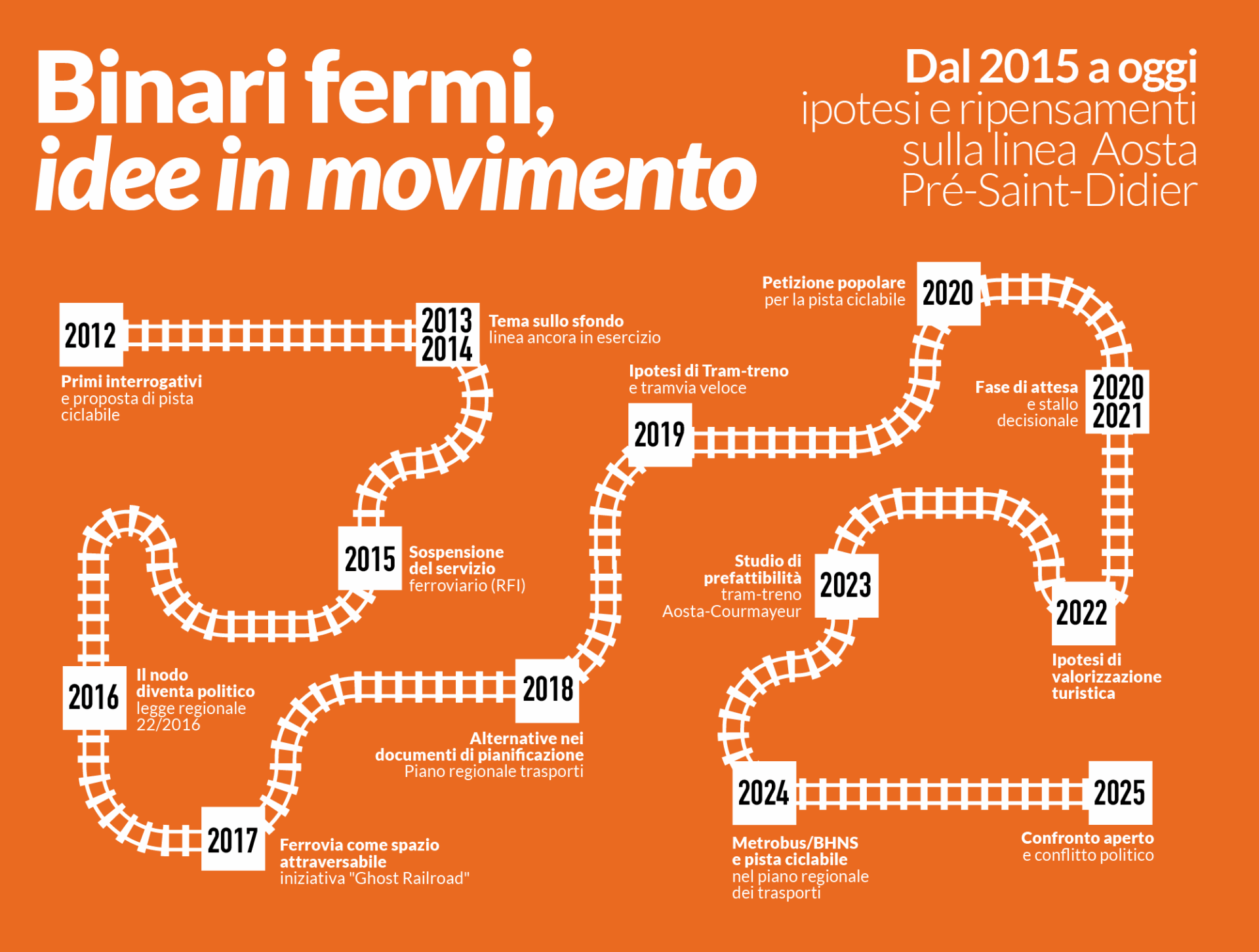 Da oltre un decennio la tratta ferroviaria Aosta–Pré-Saint-Didier è al centro di un dibattito che, con il passare degli anni, si è progressivamente spostato dal tema della riapertura del servizio ferroviario a quello di un possibile utilizzo alternativo dell’infrastruttura. Dalla sospensione dei treni nel 2015, il tracciato è rimasto formalmente attivo ma privo di funzione, diventando terreno di confronto tra visioni diverse: chi continua a rivendicare il ritorno della ferrovia e chi, invece, propone soluzioni differenti, dalla mobilità su gomma alle piste ciclabili, fino a sistemi ibridi come il tram-treno. Di seguito una ricostruzione cronologica delle principali tappe di questo percorso.