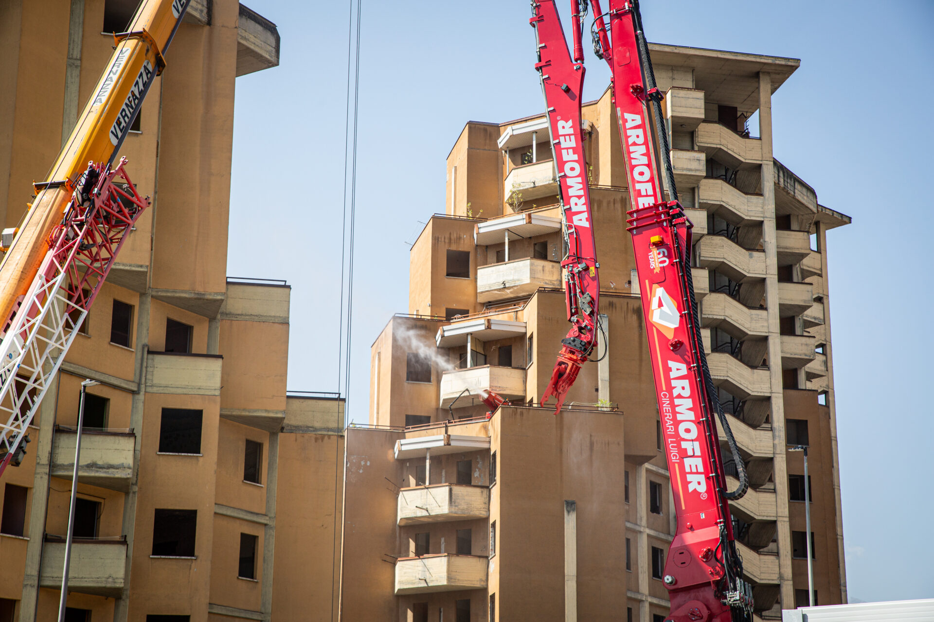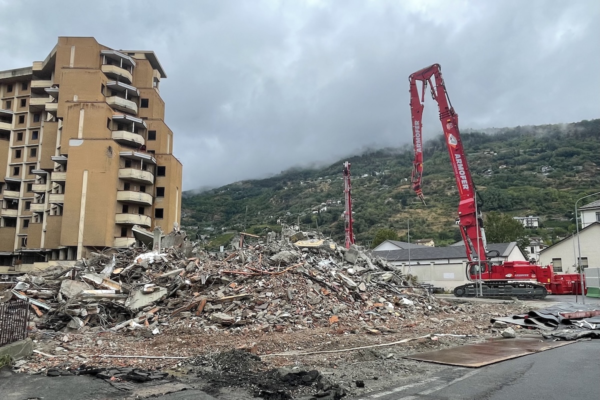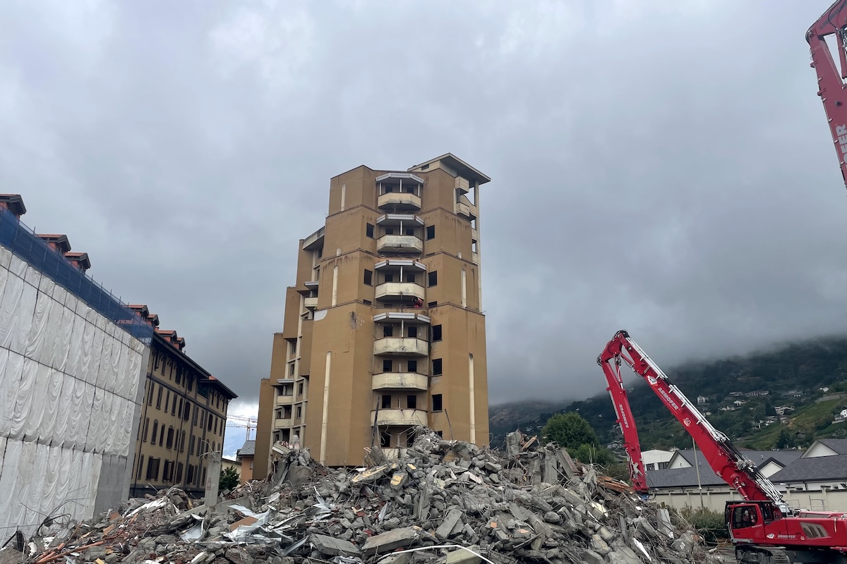 Nel luglio 2024, viene aggiudicata definitivamente la gara per l’abbattimento. Se ne occuperà la ditta Armofer Luigi Cinerari di Siziano, Pavia. Per farlo, porteranno ad Aosta lo Zeus Liebherr R980, macchina da 220 tonnellate e otto carichi eccezionali arrivata in città il 1° giugno 2025 e assemblata in loco il 3, che monta un braccio estendibile fino a 61 metri di altezza. Sarà lui a “mordere” un po’ alla volta i grattacieli con la sua pinza.