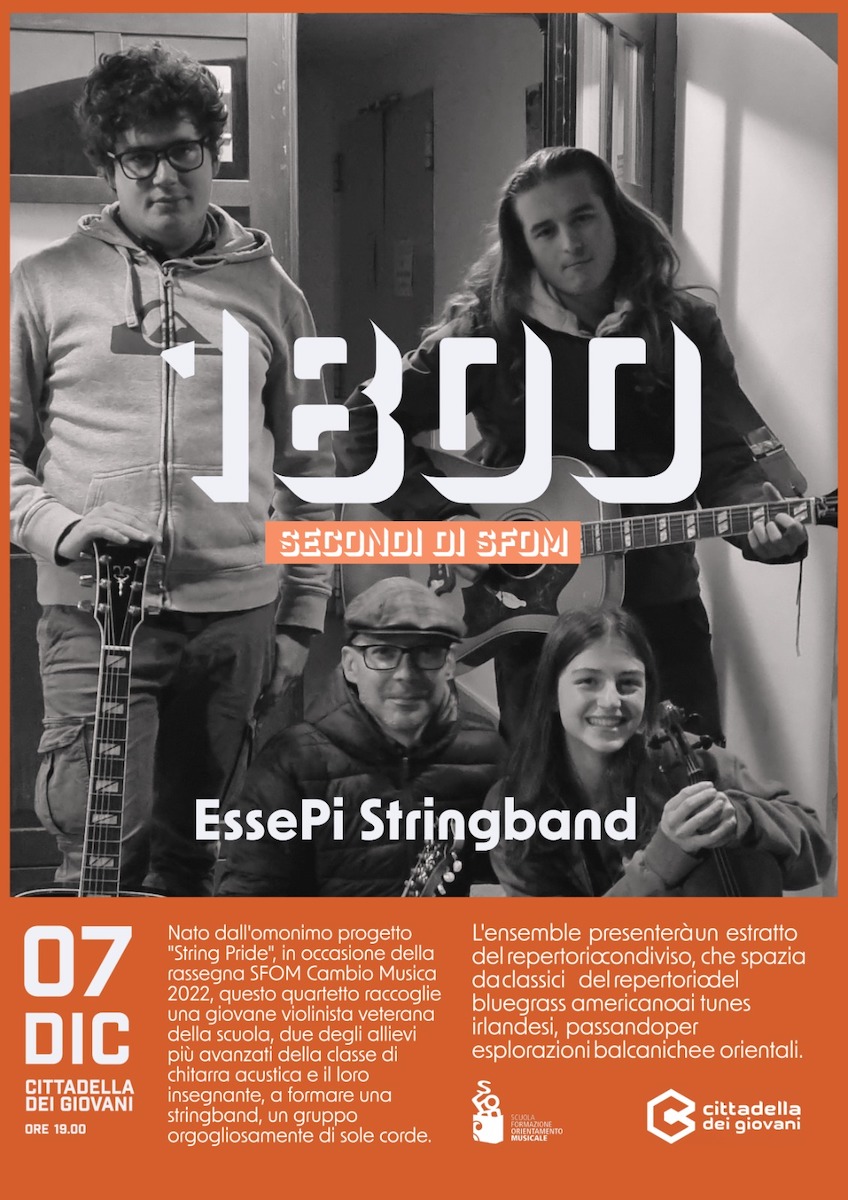 “1800 secondi di SFOM” è il titolo della nuova rassegna che, a partire da mercoledì 7 dicembre, prende il via alla Cittadella dei Giovani. Fino ad aprile 2023 a mercoledì alterni appuntamento con i ragazzi e i professori della SFOM, con generi musicali per tutti i gusti ed ensemble tutti da scoprire. La rassegna si inaugura con la EssePi Stringband.