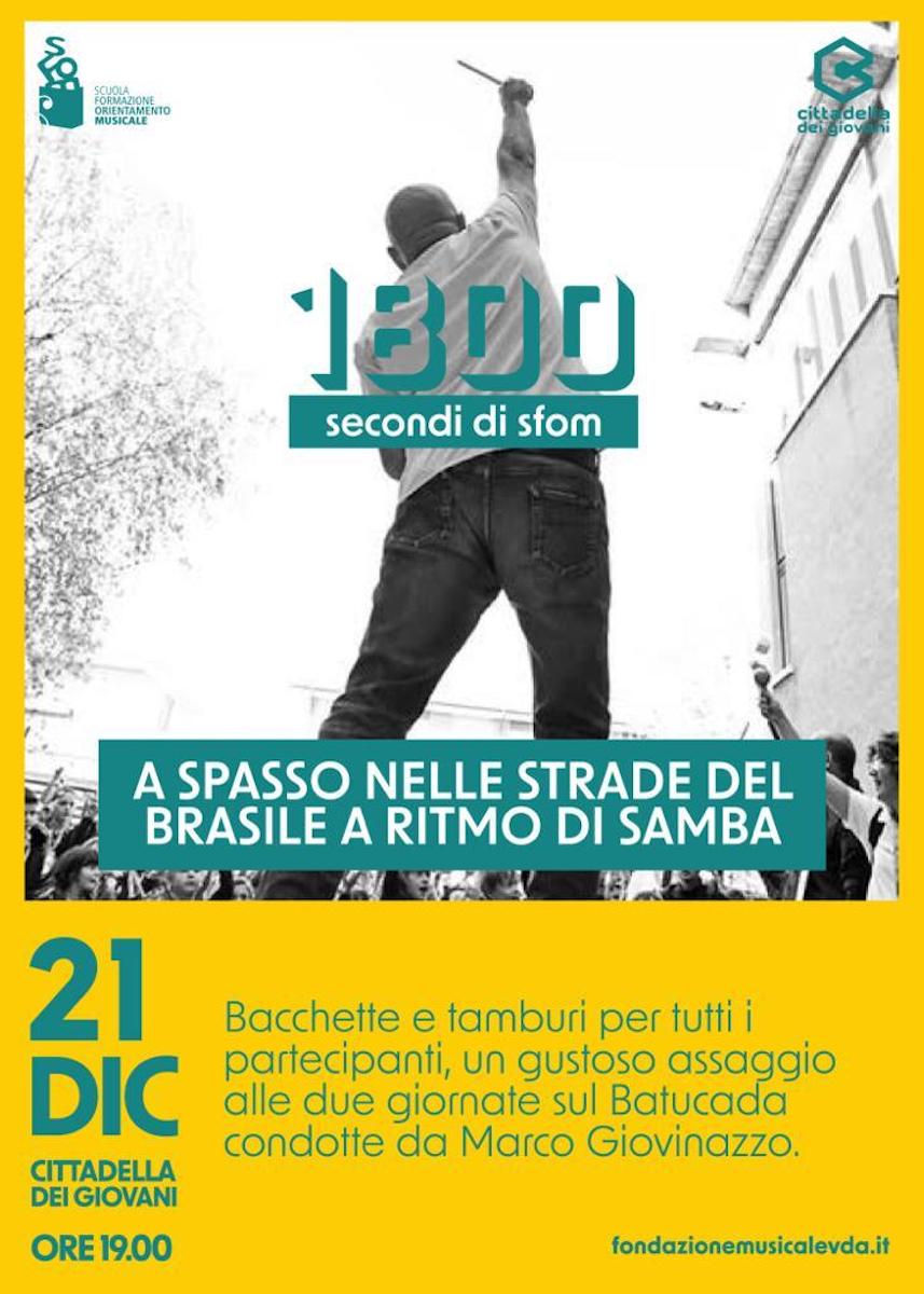 Il secondo appuntamento di “1800 secondi di SFOM”, mercoledì 21 dicembre sempre alle 19 in sala Expo, sarà “A spasso nelle strade del Brasile a ritmo di samba”. Una serata interattiva che prevede bacchette e tamburi per tutti i partecipanti, in un gustoso assaggio delle due giornate sul Batucada condotte da Marco Giovinazzo.