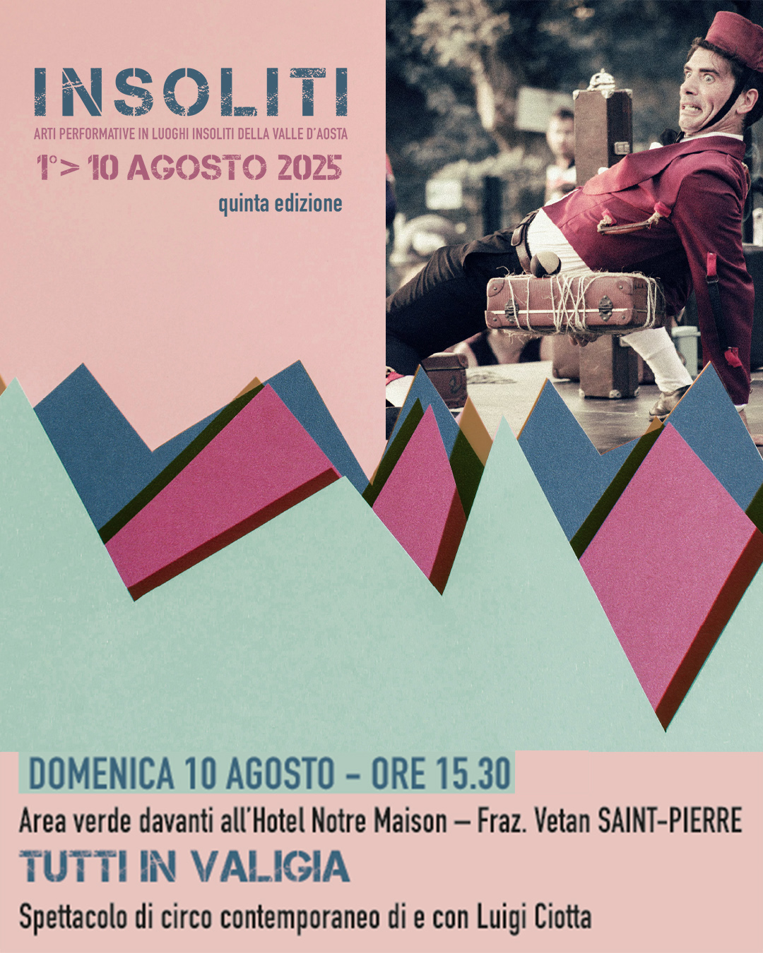 Arriva dalla Sicilia il pluripremiato artista Luigi Ciotta che con Tutti in Valigia coinvolge e gioca con il pubblico dando vita ad uno spettacolo dal ritmo incalzante e dai numerosi momenti poetici, al confine tra teatro fisico, clown e abilità circensi. Lo spettacolo è stato presentato in tutta l’Europa e in diverse parti del mondo e approda a La Thuile venerdì 8 agosto alle ore 21 nella Sala Manifestazioni Arly e domenica 10 agosto alle 15.30 a Saint-Pierre, in occasione della Festa Patronale, nell’area verde dell’Hotel Notre Maison di Vetan.