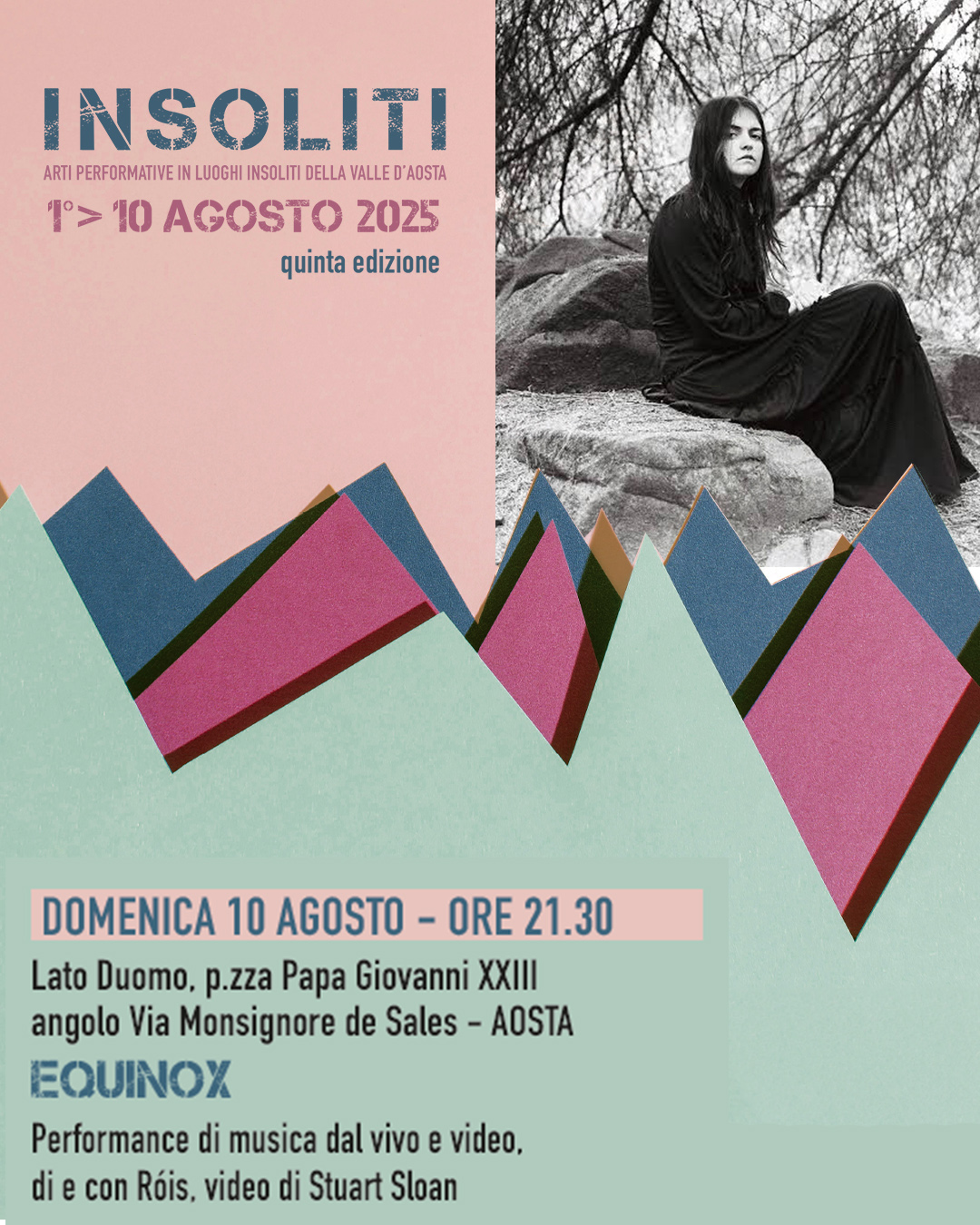 Il Festival si conclude domenica 10 agosto alle 21.30 ad Aosta in P.zza Papa Giovanni XXIII lato Duomo, con il concerto della giovane cantautrice irlandese Róis accompagnata dalle immagini di Stuart Sloan (fondatore del Festival Docs Ireland) in Equinox, una performance di musica e video originariamente commissionata e presentata in Irlanda per l’Ulster Folk Museum.
