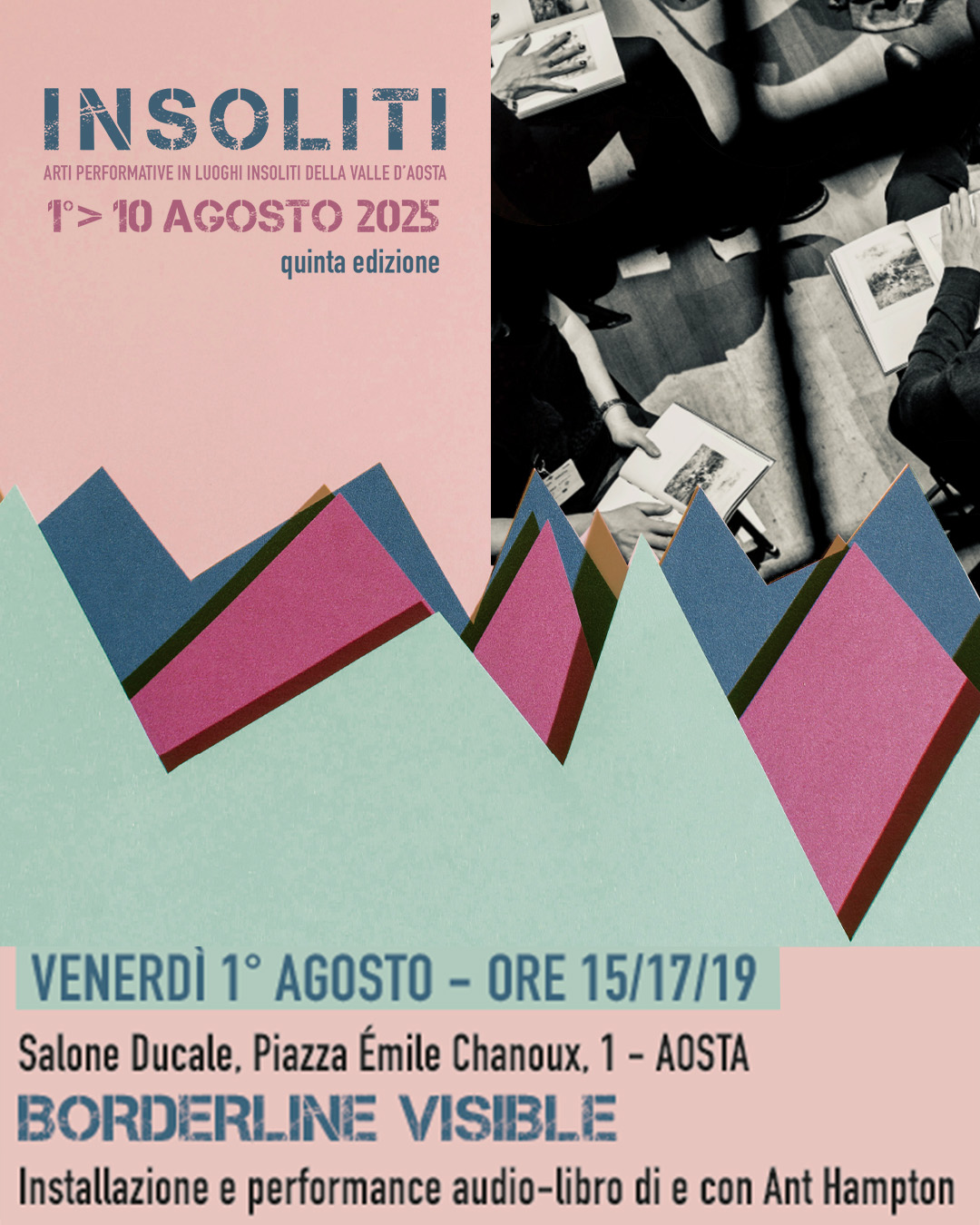 Primo appuntamento venerdì 1° agosto presso il Salone Ducale del Municipio di Aosta con la presentazione in tre turni per massimo trenta persone (ore 15-17-19), dell’installazione e performance audio-libro dal titolo Borderline Visible di e con Ant Hampton che invita gli spettatori a partecipare a un’esperienza collettiva, sfogliando le pagine del libro, capovolgendolo, confrontandone le immagini guidati da una traccia audio che combina narrazione, musica e registrazioni sul campo.