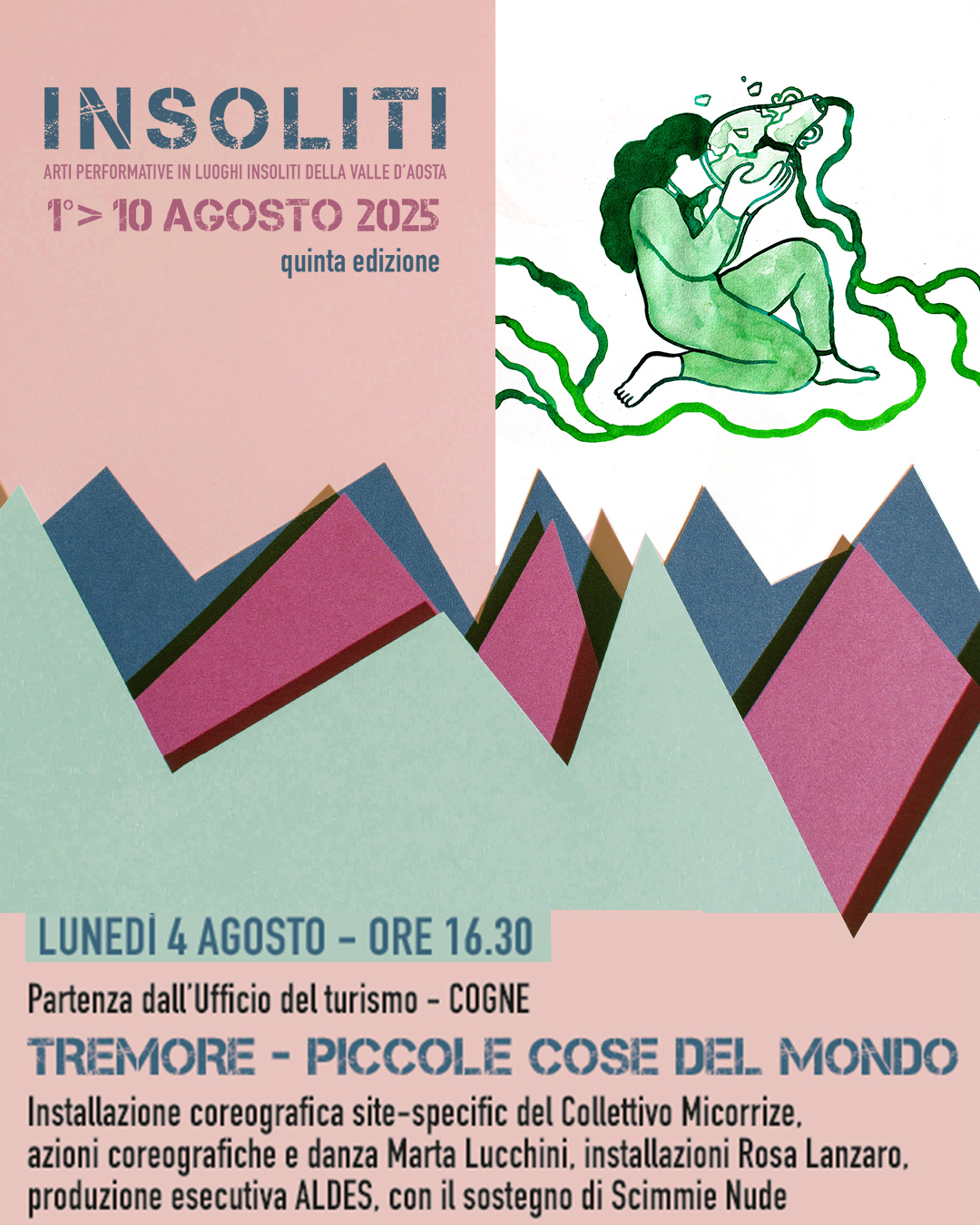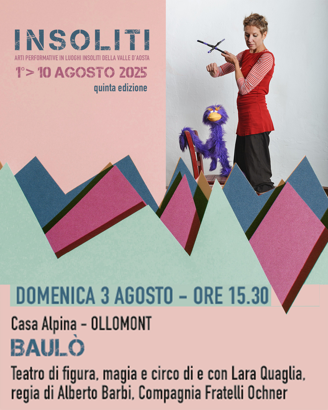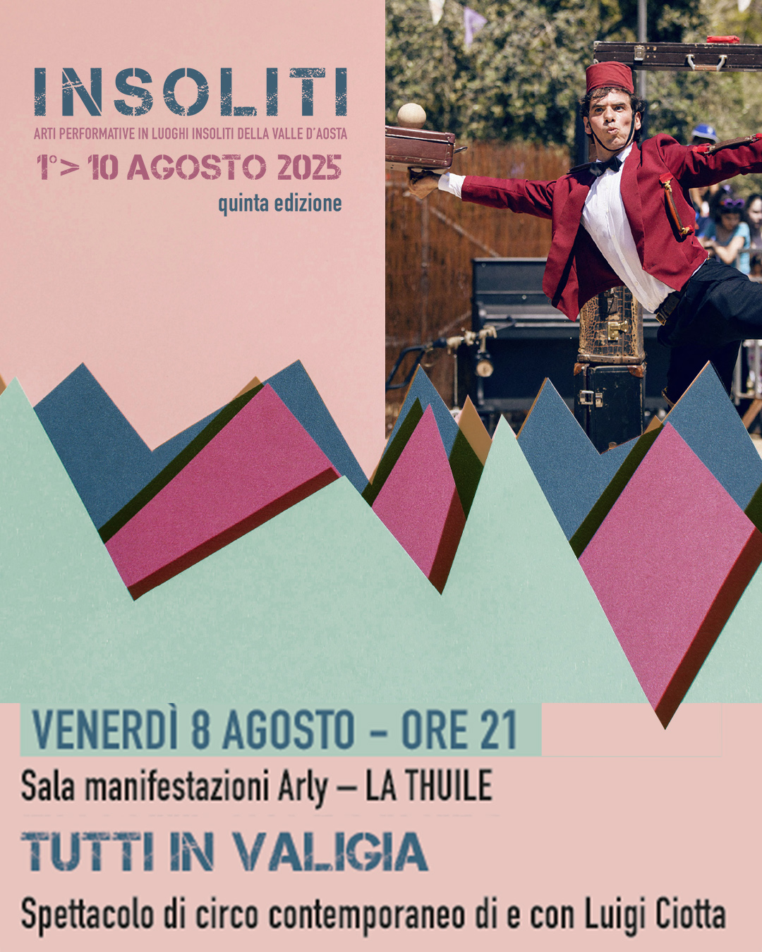 Parte venerdì 1° agosto la quinta edizione del Festival INSOLITI arti performative in luoghi insoliti della Valle d’Aosta che si svolgerà fino a domenica 10 agosto in varie località, con appuntamenti di apertura e chiusura ad Aosta venerdì 1 e domenica 10 agosto, e altri spettacoli a Ollomont, Cogne, Chamois, Torgnon, Arvier, La Thuile, Pollein, e Saint-Pierre Vetan.