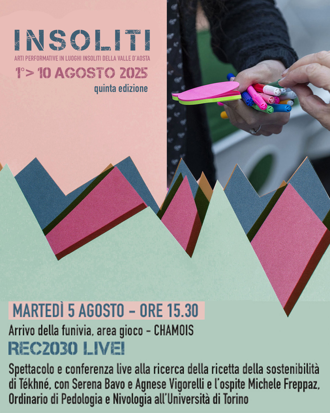 Martedì 5 agosto alle ore 15.30 nell’area gioco all’arrivo della funivia di Chamois, Michele Freppaz, ordinario di pedologia e nivologia all’Università di Torino, sarà intervistato da Serena Bavo e Agnese Vigorelli della compagnia Tékhné in una conferenza spettacolo alla ricerca della ricetta della sostenibilità.