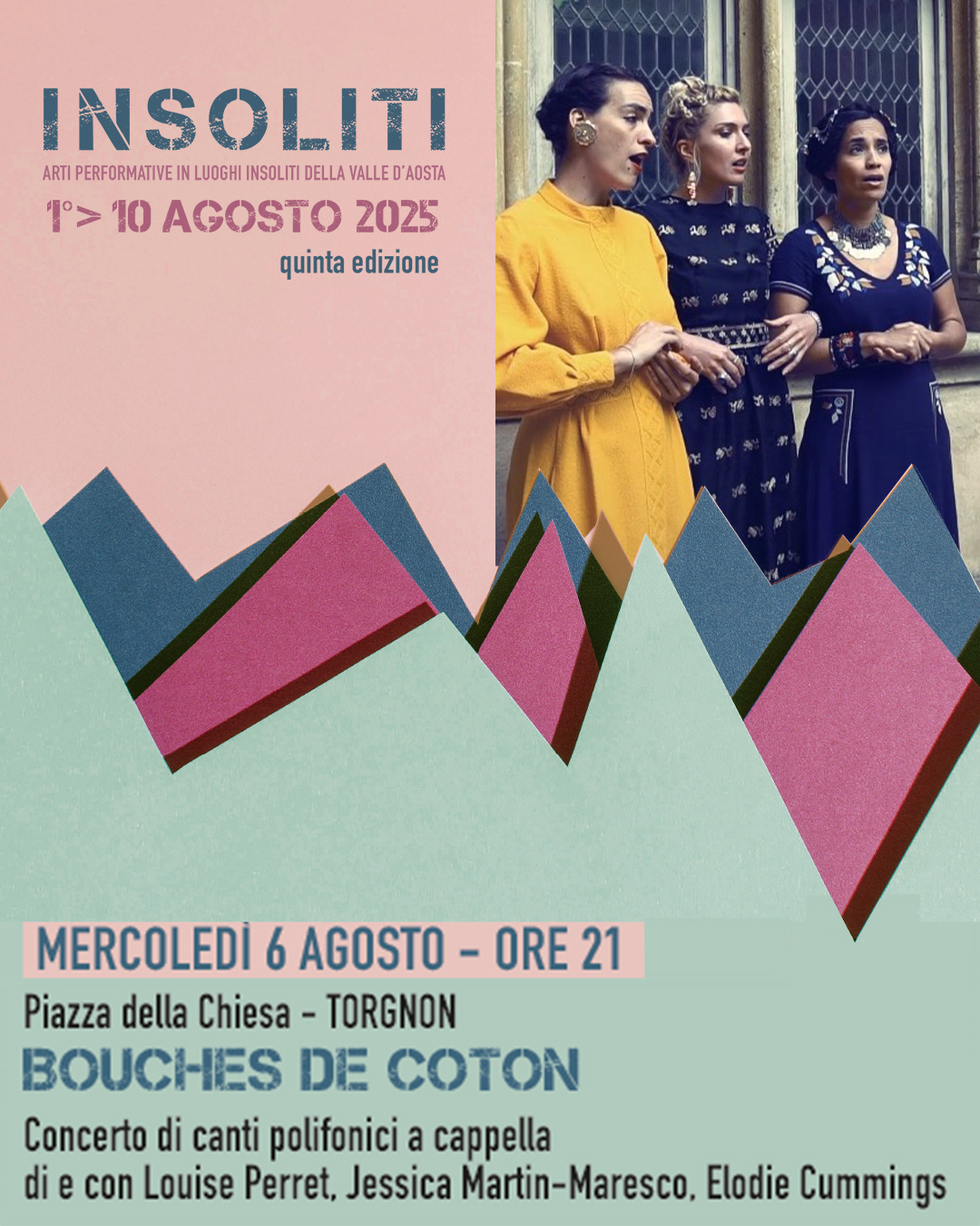 Appuntamento a Torgnon alle ore 21 del 6 agosto, nella splendida cornice della Piazza della Chiesa, per il trio francese Bouches de Coton (Louise Perret, Jessica Martin-Maresco, Elodie Cummings) che offre un repertorio di canzoni tradizionali bulgare, ucraine e macedoni cantate a cappella.