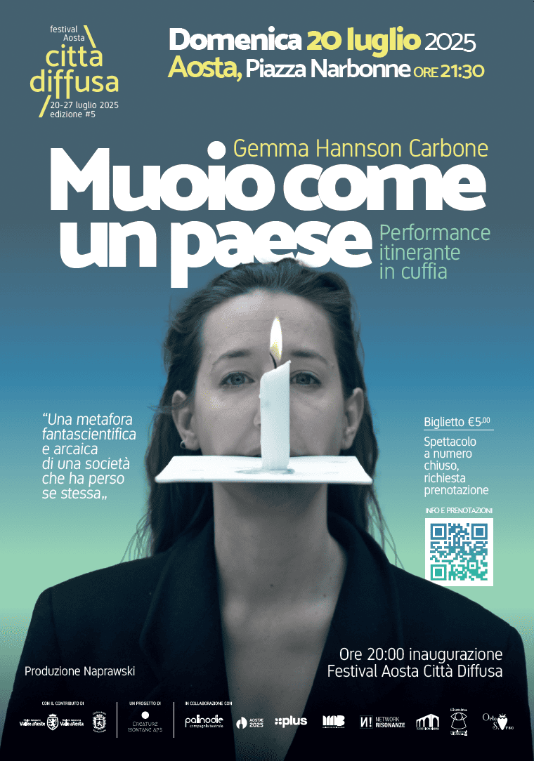 La serata si concluderà alle 21.30 con la performance in cuffia Muoio come un Paese, guidata dall’artista Gemma Hansson Carbone. Un viaggio sonoro tra fantascienza e simbolismo arcaico, definito dall’autrice come “una metafora di una società che ha perso se stessa”. L’evento è a pagamento (biglietto 5 euro) e prevede posti limitati; è possibile prenotare al numero 338 229 0726. Il festival Aosta Città Diffusa proseguirà con il programma completo da giovedì 24 a domenica 27 luglio 2025, in diversi luoghi della città.