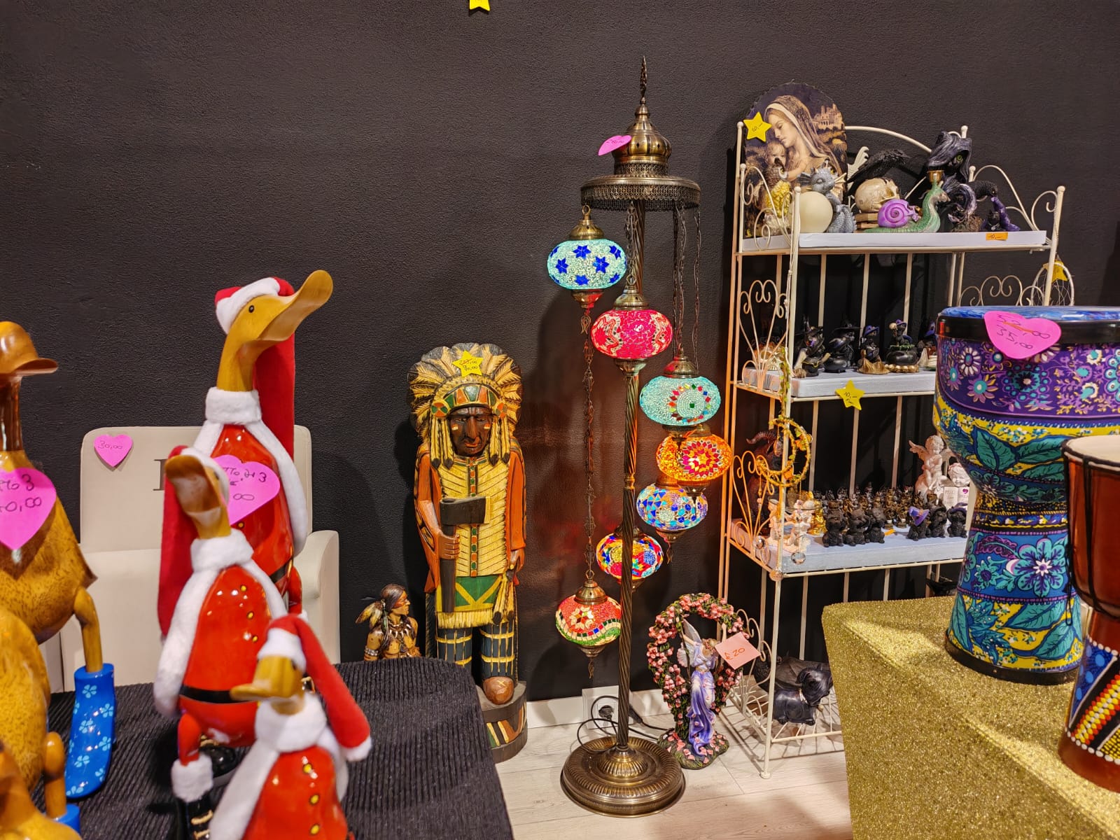 Passeggiando tra i banchi si incontrano oggetti da cucina – tazze e tazzine con motivi di montagna – lampade in stile marocchino, giochi per bambini, quadri, una macchina da scrivere Olivetti, attrezzatura da palestra, monopattini quasi nuovi e perfino una moto. Non mancano elementi per esterni, come una fontana e arredi per balconi e giardini, insieme a pezzi legati all’immaginario tradizionale alpino e a disegni e oggetti firmati.