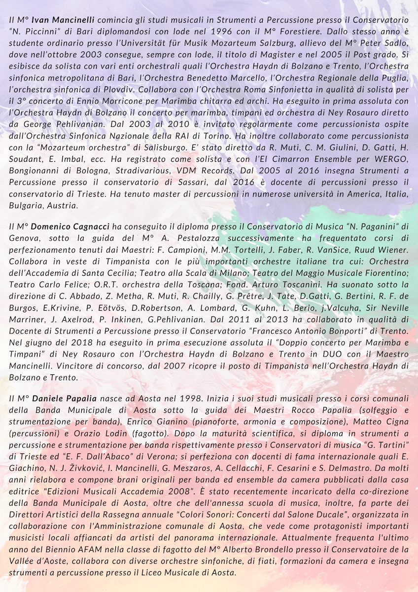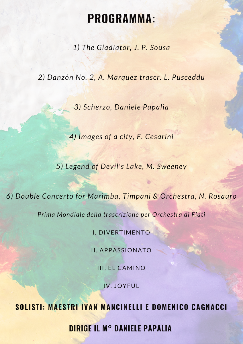 Il brano successivo è “Legend of Devil’s Lake”, composto da Michael Sweeney dove sonorità oscure con melodie delicate contrastano con il ritmo serrato delle percussioni. L’ultimo brano, che vede impegnati anche il M° Mancinelli, solista internazionale e docente al Conservatorio di musica “G. Tartini” di Trieste, e il M° Cagnacci, timpanista principale dell’ “Orchestra Haydn” di Bolzano e Trento, si intitola “Double Concerto for Marimba, Timpani & Orchestra”, scritto dal compositore brasiliano e percussionista Ney Rosauro. Il brano verrà eseguito in prima mondiale nell’arrangiamento per orchestra di fiati. Melodie liriche e ritmi accattivanti si intrecciano ombinazione tra i due strumenti a percussione e un’orchestrazione molto leggera.