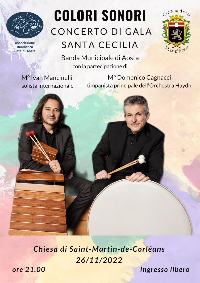 Sono gli strumenti a percussione i protagonisti del primo appuntamento della IV edizione della Rassegna Concertistica “Colori Sonori” organizzata dall’Associazione bandistica città di Aosta in collaborazione con l’Amministrazione comunale di Aosta. Il concerto di apertura sarà quello di Santa Cecilia, sabato 26 novembre alle 21.00 presso la Chiesa di Saint-Martin-de-Corléans. Ad esibirsi sarà la Banda Municipale della città di Aosta diretta dal M° Daniele Papalia con la partecipazione dei solisti internazionali M° Ivan Mancinelli alla marimba e M° Domenico Cagnacci ai timpani.