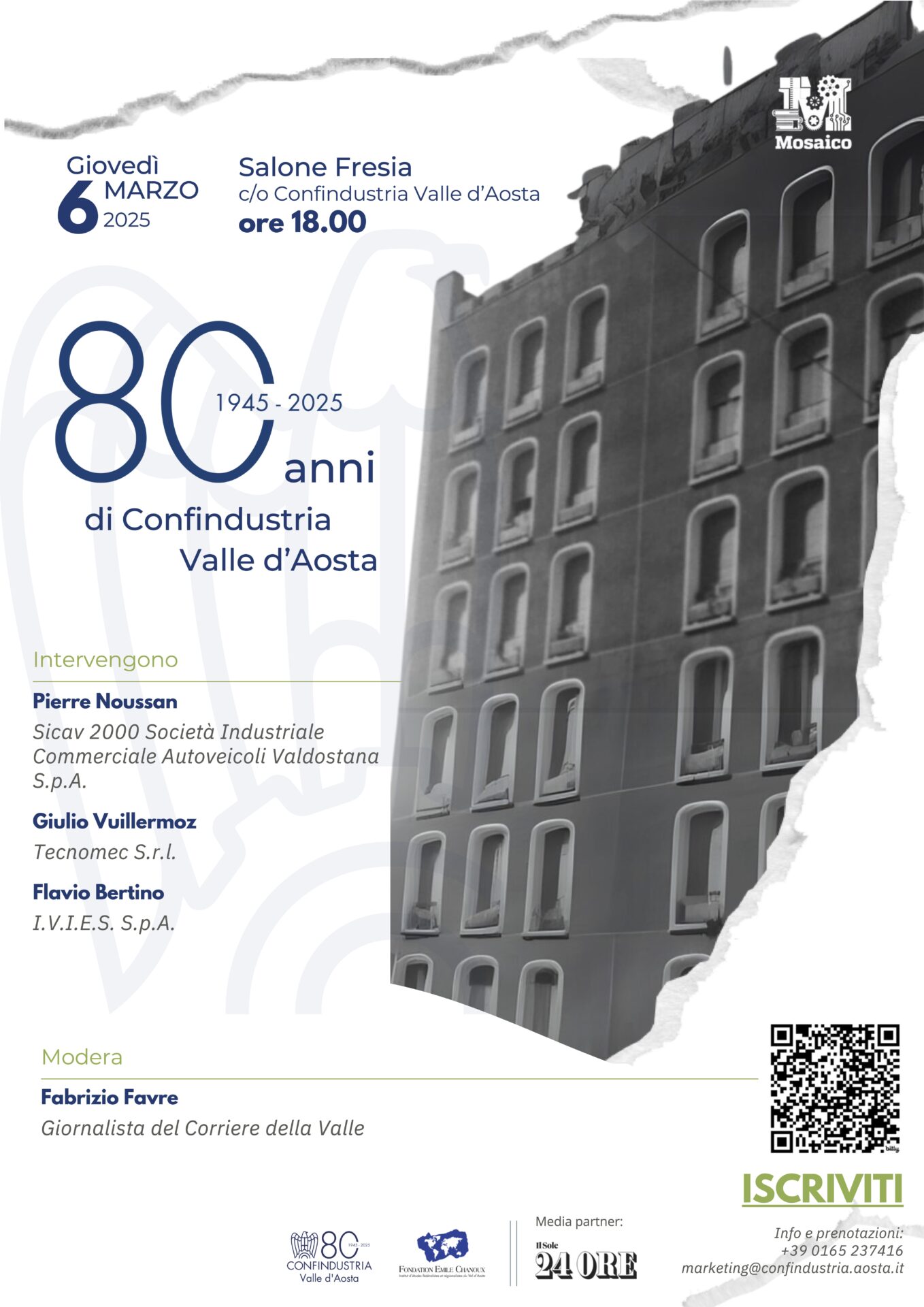 L’appuntamento è per giovedì 6 marzo 2025 alle 18 al Salone Fresia, nella sede di Confindustria Valle d’Aosta in avenue du Conseil des Commis, 24. Dialogheranno con Fabrizio Favre, giornalista del Corriere della Valle e autore del libro pubblicato per i 70 anni dell’Associazione, Pierre Noussan, Giulio Vuillermoz e Flavio Bertino. I tre imprenditori racconteranno il loro impegno nell’Associazione e l’evoluzione dell’industria in questi 80 anni.