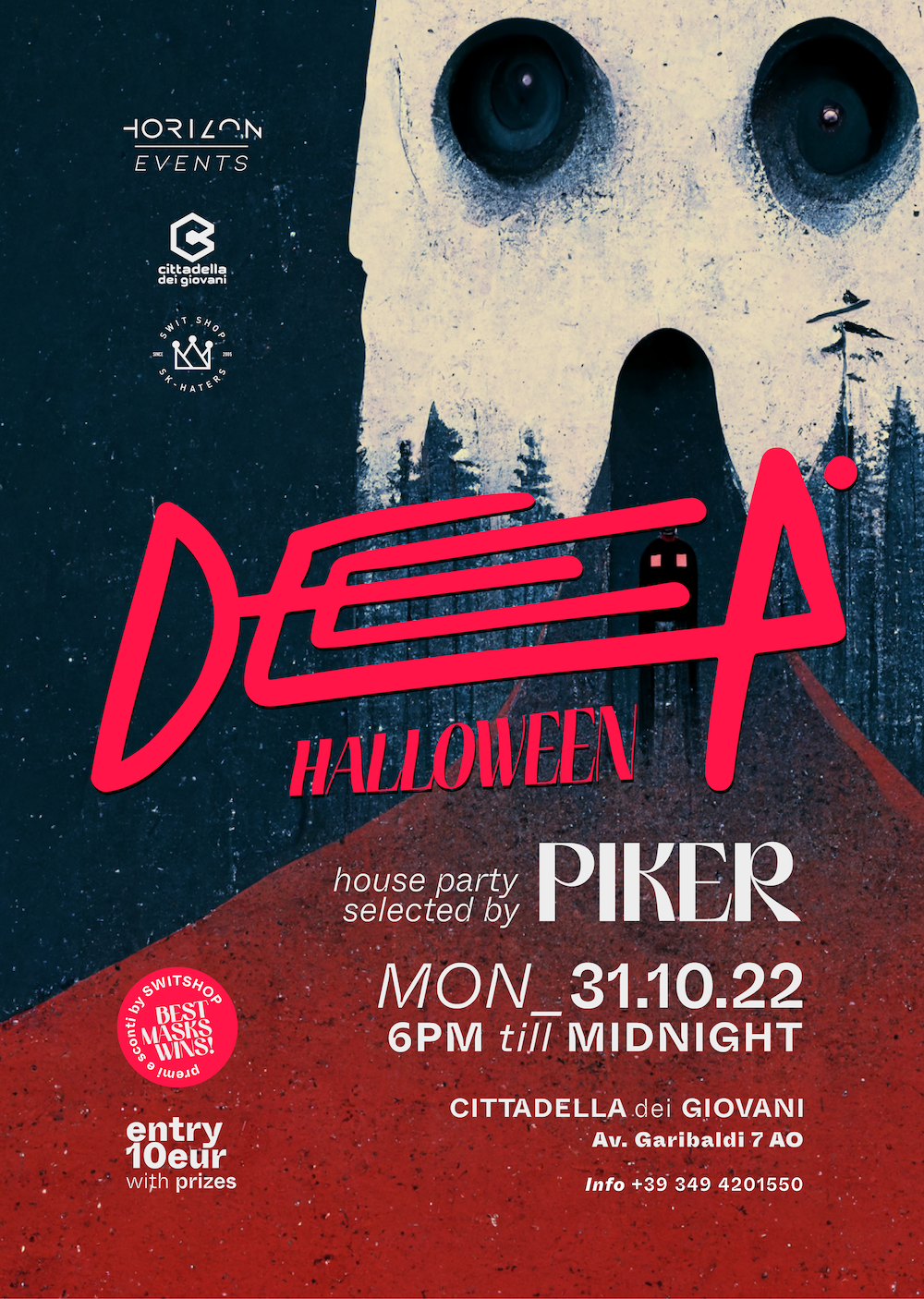 Lunedì 31 ottobre dalle 18 alle 24 nel Teatro della Cittadella Piker DJ, propone la sua selezione musicale in cui sfoggia tutta la sua esperienza. L’evento è targato “Deep Motive”, progetto avviato da Horizon Events insieme allo stesso dj valdostano e a Wicked Studio per promuovere una cultura del clubbing diversa, in cui è la qualità della musica, a fare la differenza, seguendo la scena di Londra. L’ingresso è a pagamento, un biglietto costa di 10 euro e comprende la possibilità di partecipare alla lotteria e alla selezione delle migliori maschere di Halloween, grazie alle quali verranno offerti dei ghiotti premi tra cui buoni sconto e merchandise messo a disposizione dal negozio di articoli sportivi e streetwear SwitShop, ma anche prevendite e sconti spendibili nei prossimi eventi targati Deep Motive e molto altro.