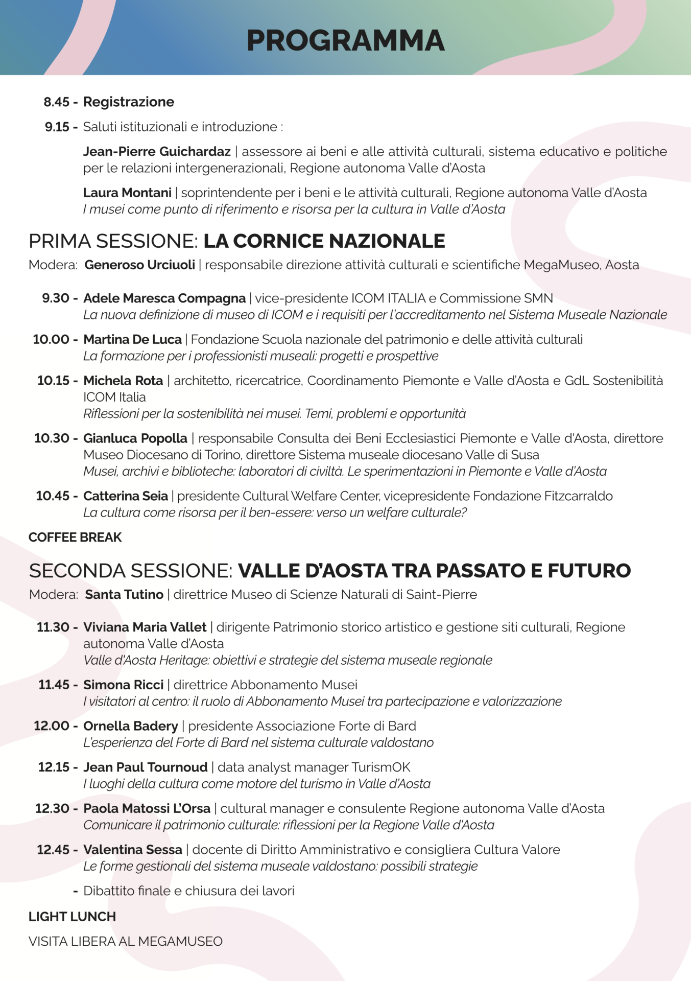 Il convegno si articolerà in due momenti distinti: una prima sessione dedicata al contesto nazionale e alle principali sfide che coinvolgono i musei oggi, seguita da un approfondimento sul caso della Valle d’Aosta, intesa come possibile laboratorio di buone pratiche, innovazione e governance culturale centrata sulle comunità.