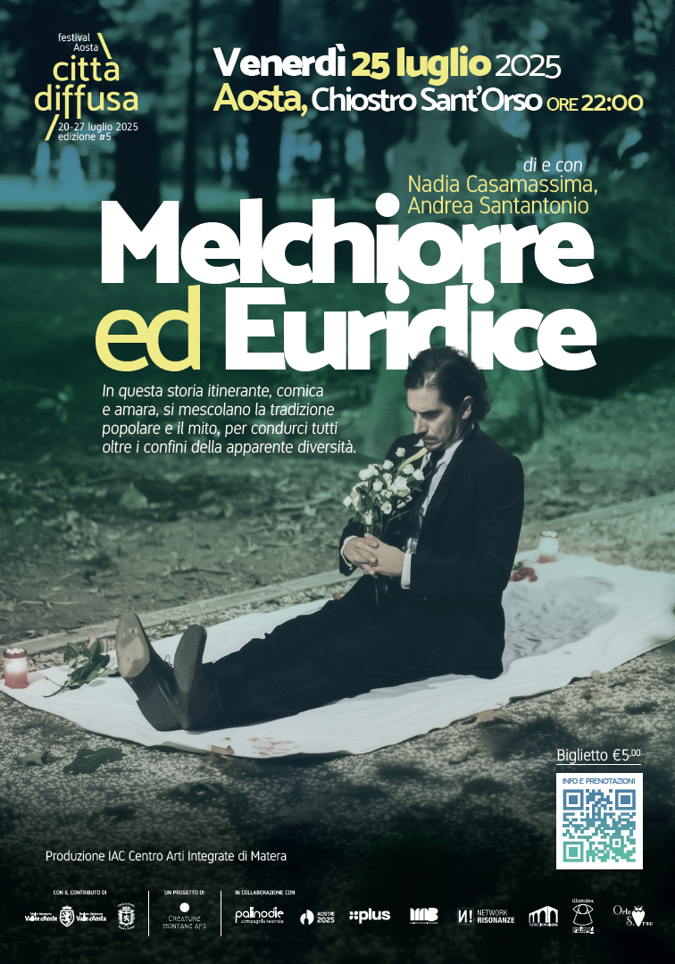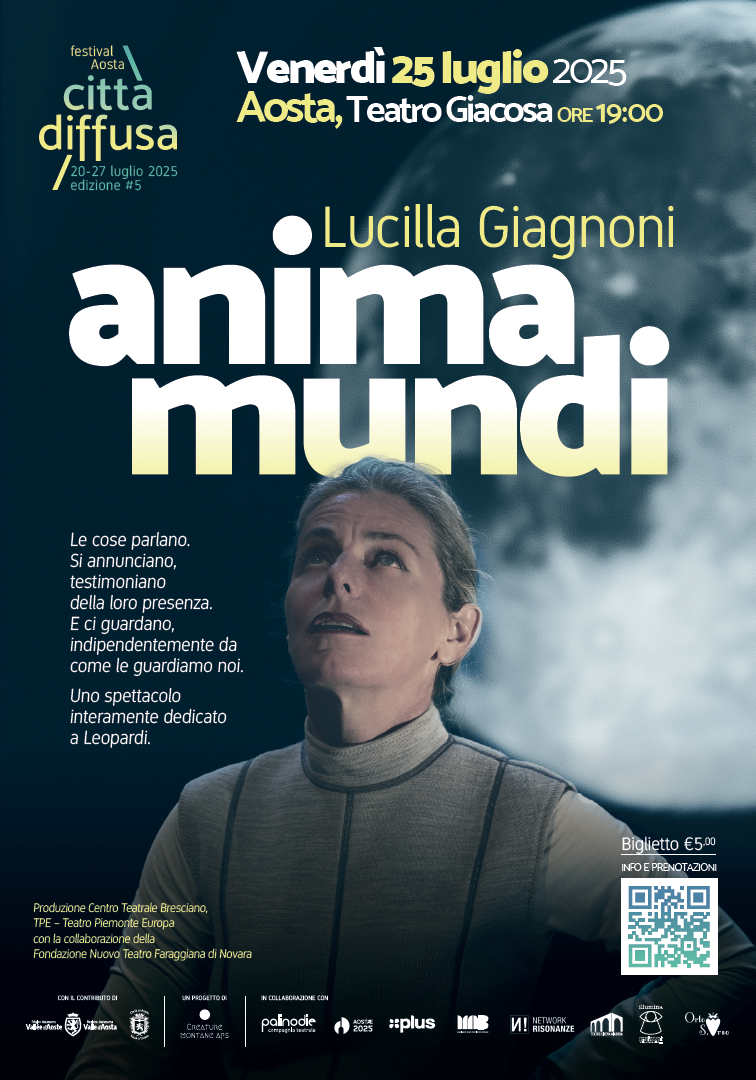 Alle 19 il Teatro Giacosa di Aosta ospita lo spettacolo Anima Mundi, con Lucilla Giagnoni. Un omaggio poetico a Giacomo Leopardi e al suo legame profondo con la Natura e l’anima del mondo. Produzione Centro Teatrale Bresciano e TPE. Alle 22:00, con partenza dal Chiostro di Sant’Orso (via Sant’Orso), Melchiorre ed Euridice propone uno spettacolo itinerante firmato da Nadia Casamassima e Andrea Santantonio, dedicato al tema della diversità e dell’appartenenza. Un racconto tra mito e comicità che riflette sul legame tra uomo e natura. Produzione IAC di Matera.