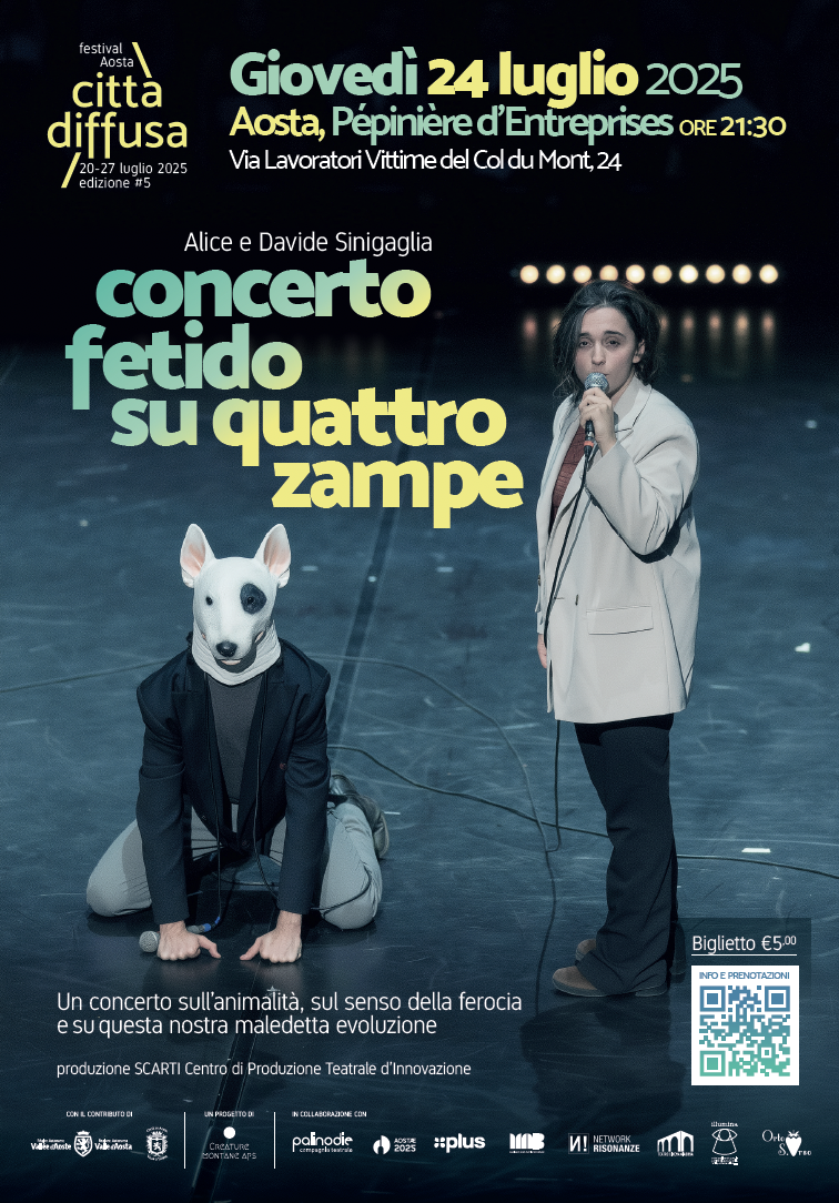Alle 21:30 alla Pépinière di Aosta (via Lavoratori vittime del Col du Mont 24), il duo Alice e Davide Sinigaglia porta in scena Concerto fetido su quattro zampe, una performance teatrale musicale che riflette sull’animalità e la condizione umana, tra rap e filosofia. Lo spettacolo è prodotto da Scarti Centro di Produzione Teatrale d’Innovazione e selezionato dal Romaeuropa Festival 2023.