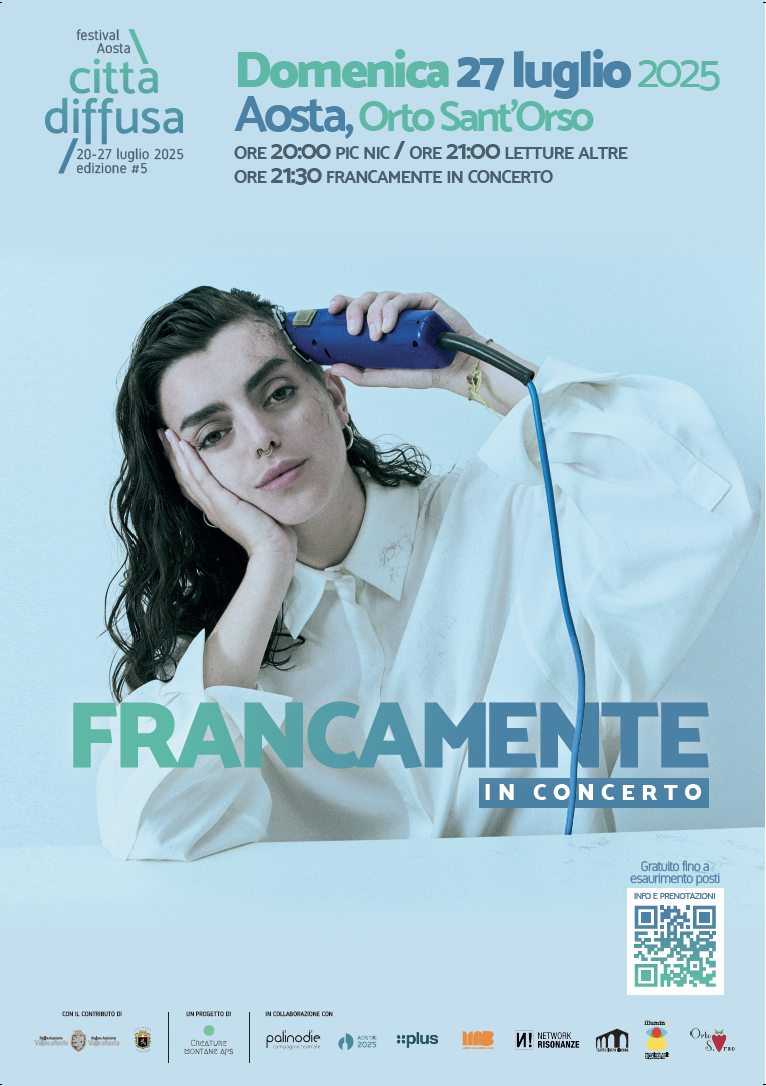 A chiudere il festival, alle 21:30, sarà il concerto di Francamente, progetto musicale queer nato a Torino e cresciuto a Berlino, che coniuga cantautorato ed elettronica con un forte impegno sociale. L’artista ha partecipato a X Factor Italia e fa parte del collettivo transfemminista “Canta fino a dieci”.