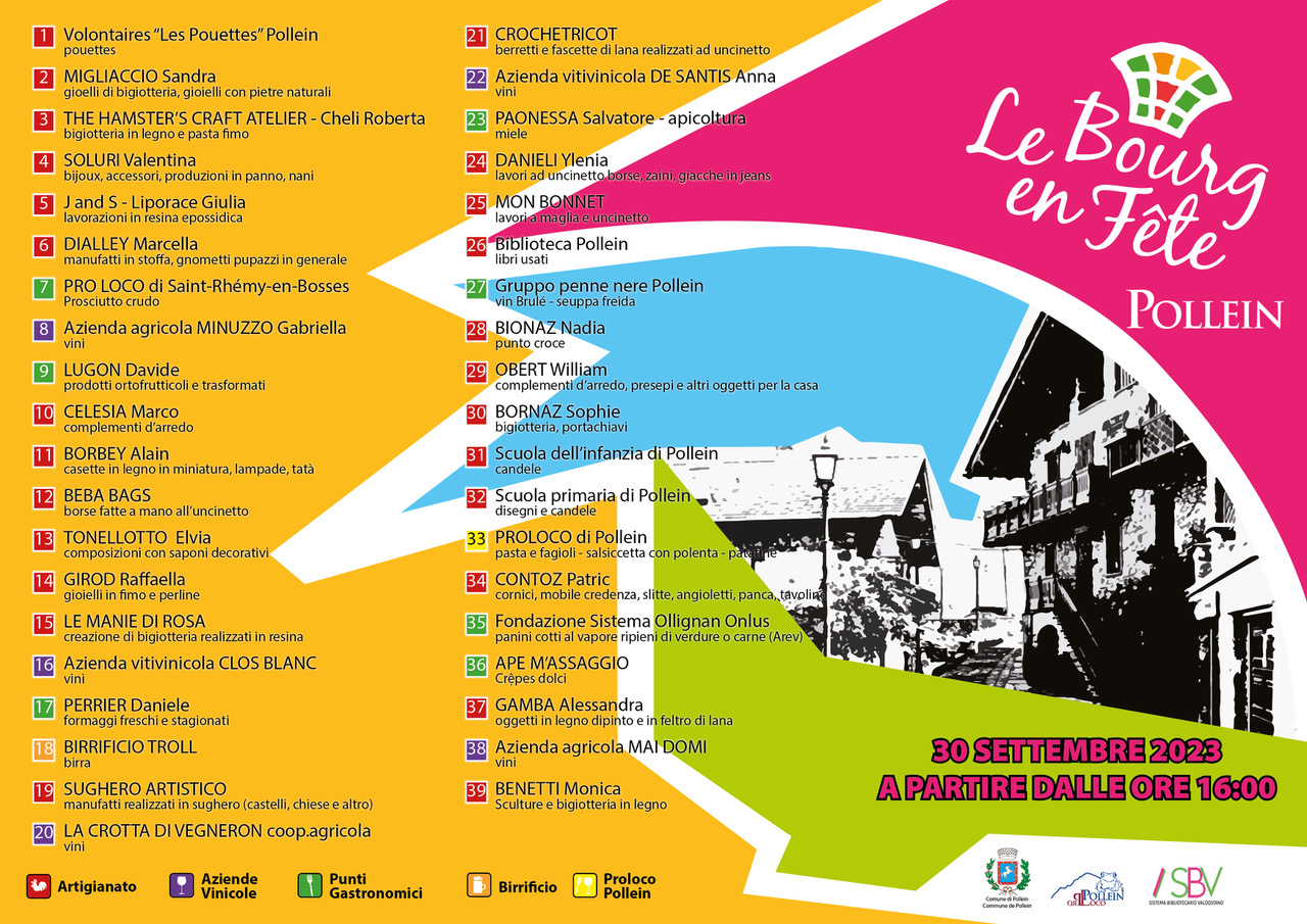 Dalle 16,00 e sino alla tarda serata del prossimo sabato 30 settembre, “Le bourg en fête” permetterà ai presenti di ammirare le creazioni artigianali e degustare le prelibatezze di oltre 40 espositori. Alle 18,00 è poi in programma la premiazione del concorso organizzato dalla biblioteca “Biblio Challenge: leggo e vinco”.