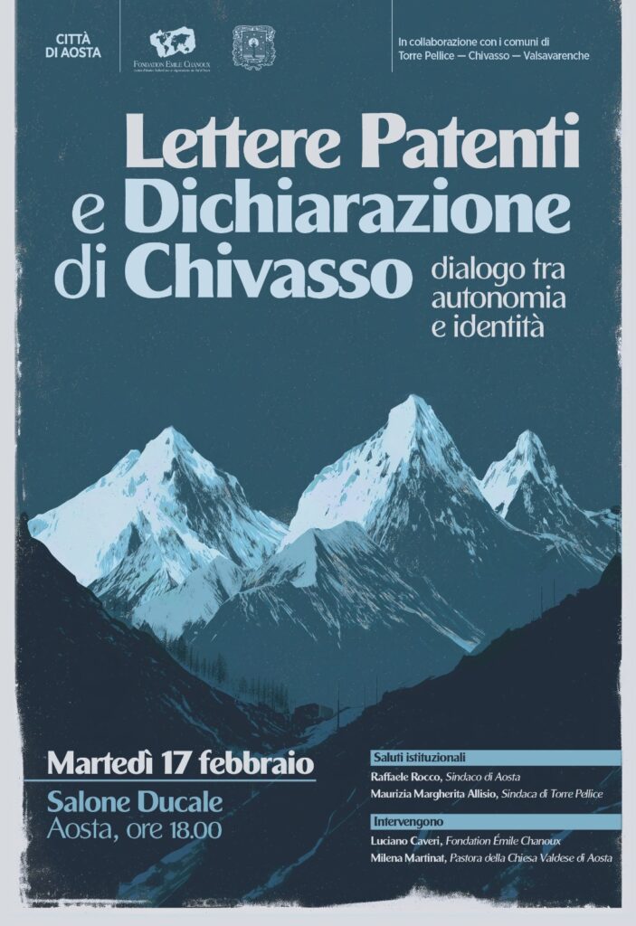 Martedì 17 febbraio, alle ore 18, il Salone Ducale di Aosta ospiterà l’incontro pubblico Lettere Patenti e Dichiarazione di Chivasso: dialogo tra autonomia e identità.