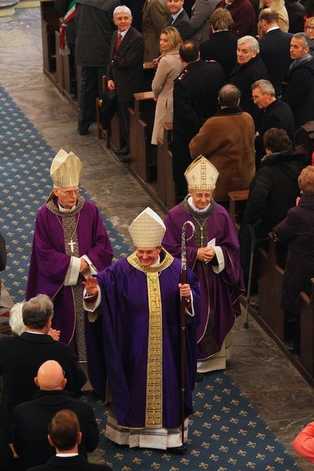 A presiedere l’ordinazione è stato l’arcivescovo di Torino Cesare Nosiglia, insieme a Giuseppe Anfossi, Vescovo emerito. Accanto a lui i suoi “compagni di messa”: don Aldo Armellin e don Carmelo Pellicone. Foto Moreno Vignolini