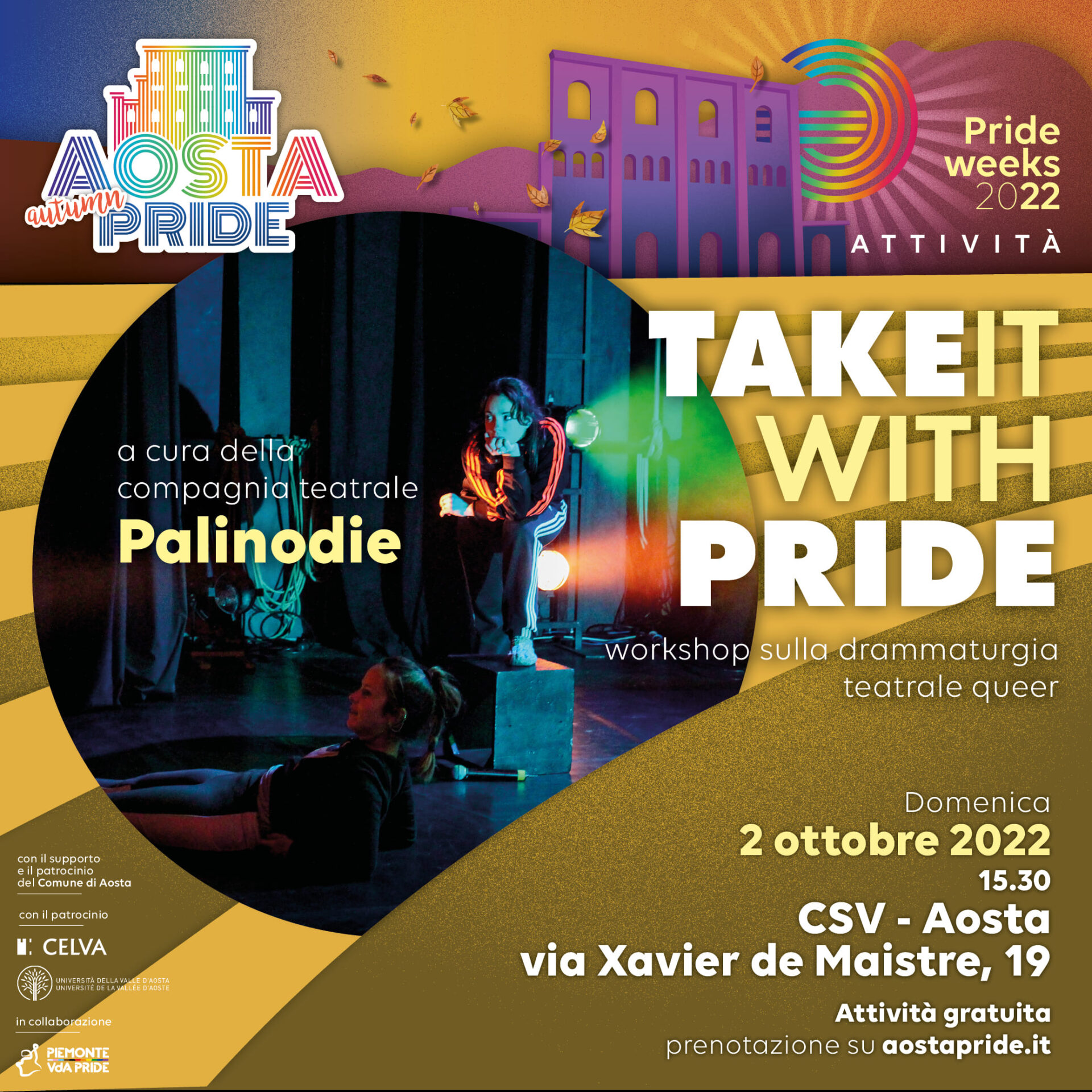 Sempre questo fine settimana, domenica 2 ottobre alle 15.30 presso la sede del CSV ad Aosta, ci sarà un workshop di teatro “Take it with Pride” a cura della compagnia teatrale Palinodie. Stefania Tagliaferri e Verdiana Vono guideranno un percorso per esplorare il mondo della drammaturgia teatrale queer. Il pomeriggio è aperto a tutt*.