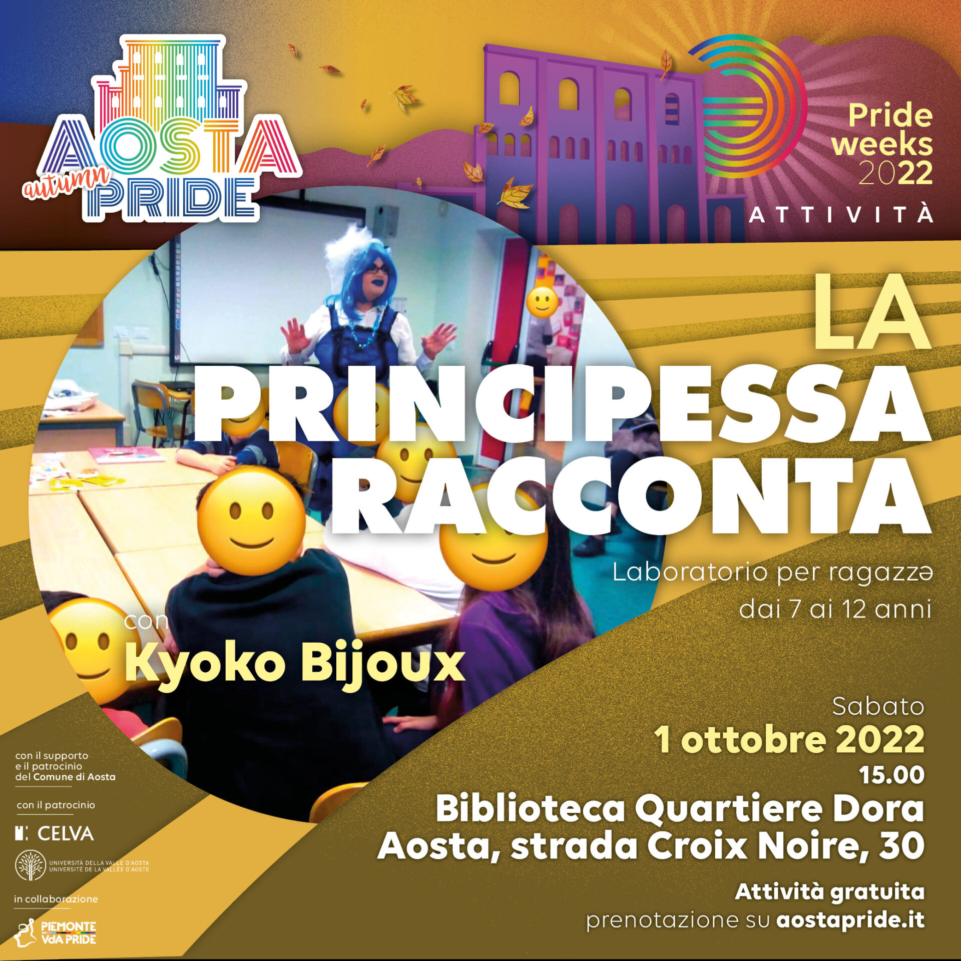 Un appuntamento della Pride Week dedicato ai ragazzi e ai bambini dai 7 ai 12 anni, è il workshop “la Principessa racconta”, che si terrà sabato 1° ottobre alle 15 presso la biblioteca del Quartiere Dora. La Drag Queen Kyoko Bijoux accompagnerà i bambin* in una discussione aperta sul maschile e il femminile, che cosa significa il concetto di genere e come sta cambiando negli ultimi anni. In questo percorso in cui “…la Principessa racconta…” attraverso la saggezza popolare della favola, si affronta quindi il tema del genere, che non sempre coincide con la sessualità di nascita dell’individuo, in una passeggiata leggera ma ferma che aiuterà a problematizzare e ad affrontare il delicato argomento del genere.