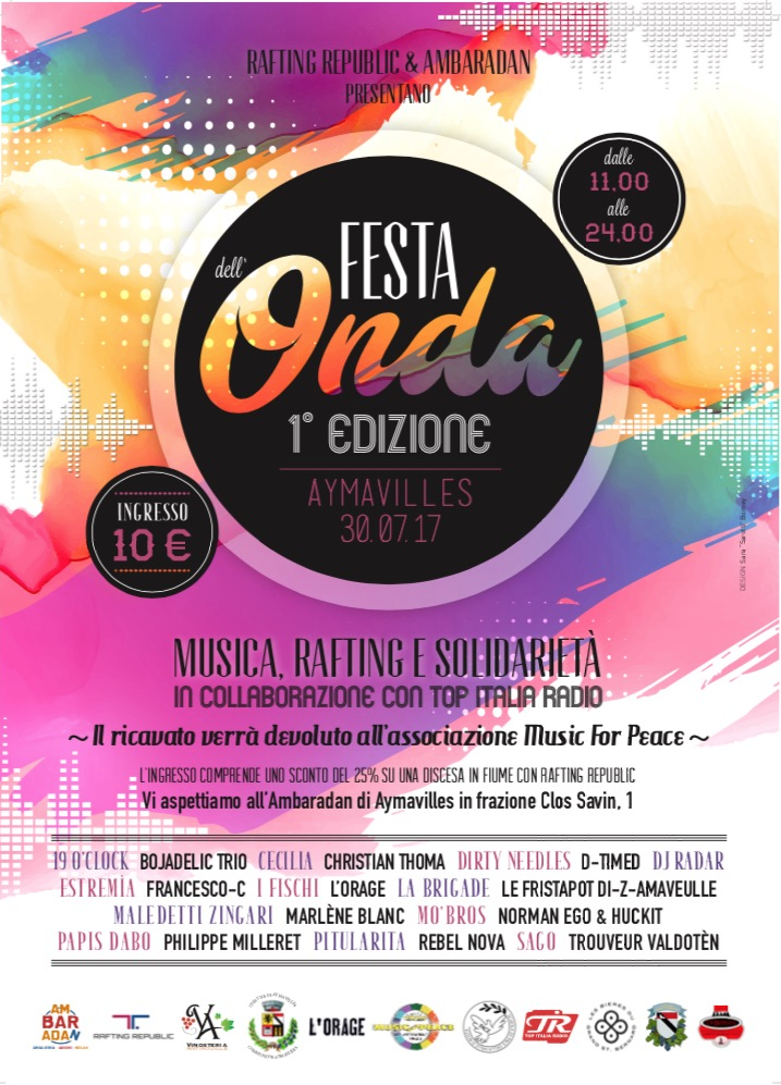 Aymavilles – domenica 30 luglio – dalle 11.00/24.00 – Nel segno del partenariato che L'Orage ha stretto con l'associazione "Music for Peace", è prevista la 1a edizione della "Festa dell'Onda",che si terrà presso la "Rafting Republic" di Aymavilles in collaborazione con il bar "Ambaradan".