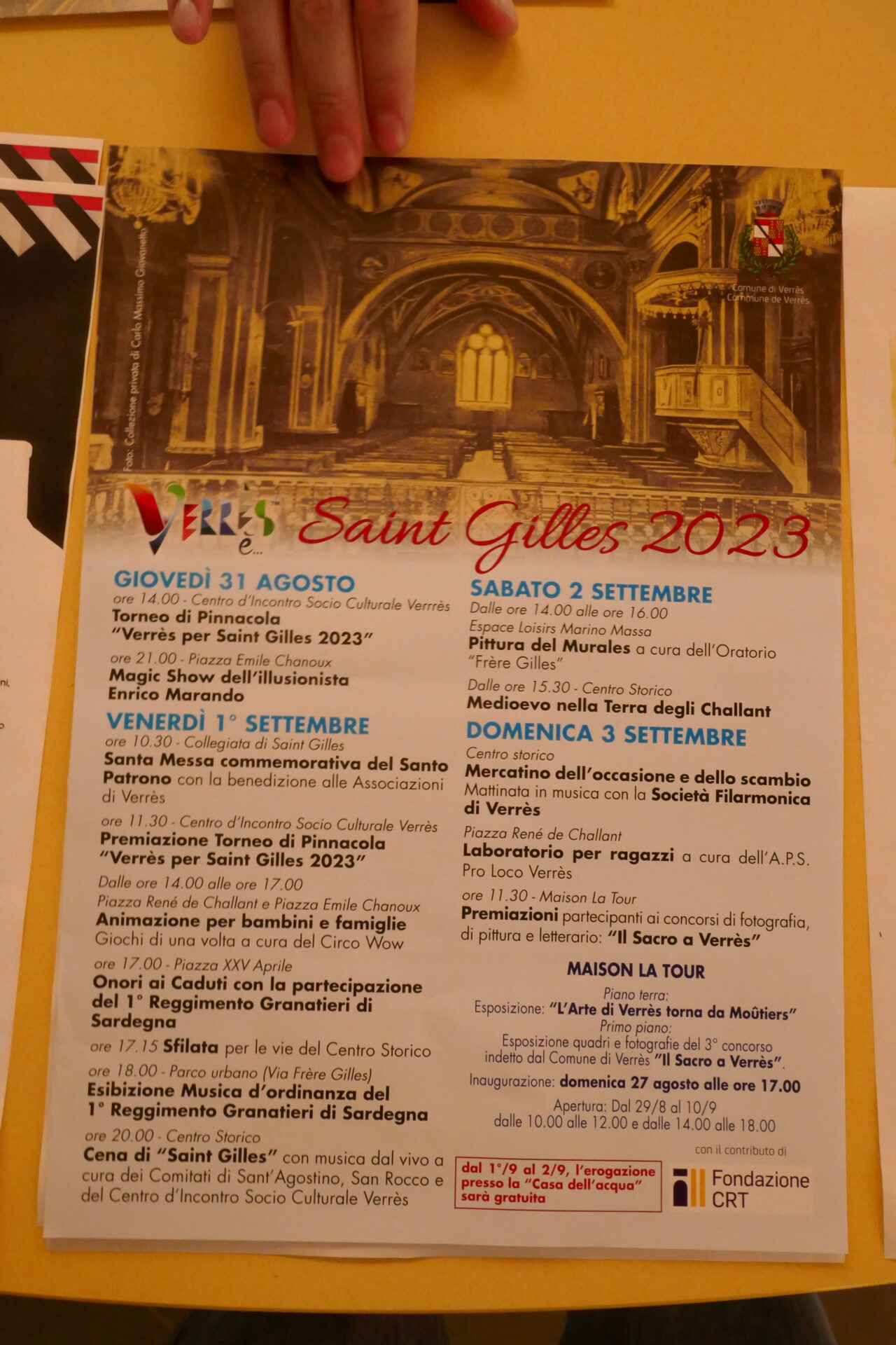 Per poi chiudere alle 20 con una cena nel centro storico, accompagnata da musica dal vivo a cura dei tre preziosi comitati: di Sant’Agostino, San Rocco e del Centro Socio Culturale di Verrès. “Questo è un altro obiettivo che l’amministrazione ha raggiunto: quello di unire tre comitati”, sottolinea Rossi. “Sarà una cena che permetterà di socializzare ancora di più”, dice di quest’attività che già si faceva prima della pandemia, ma è stata ora riproposta proprio grazie alla presenza dei tre comitati.