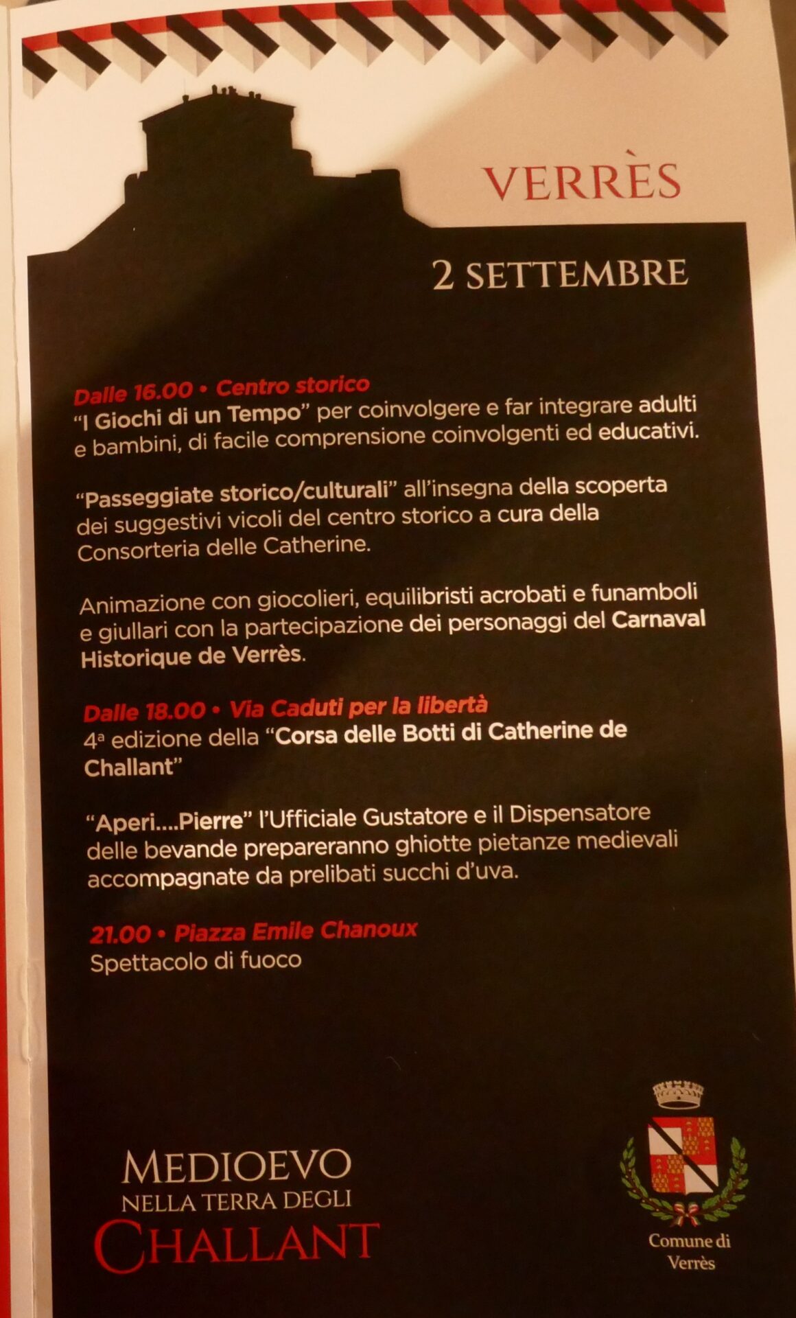Le attività medievali inizieranno alle 15.30, e alcune di queste sono nuove: “ci sono gruppi storici che non sono mai stati a Verrès e per la prima volta abbiamo coinvolto anche la consorteria delle Caterine di Challant, che presenterà esibizioni teatrali e ci sarà una passeggiata culturale non nel centro storico, ma nelle vie laterali” informa il vicesindaco.