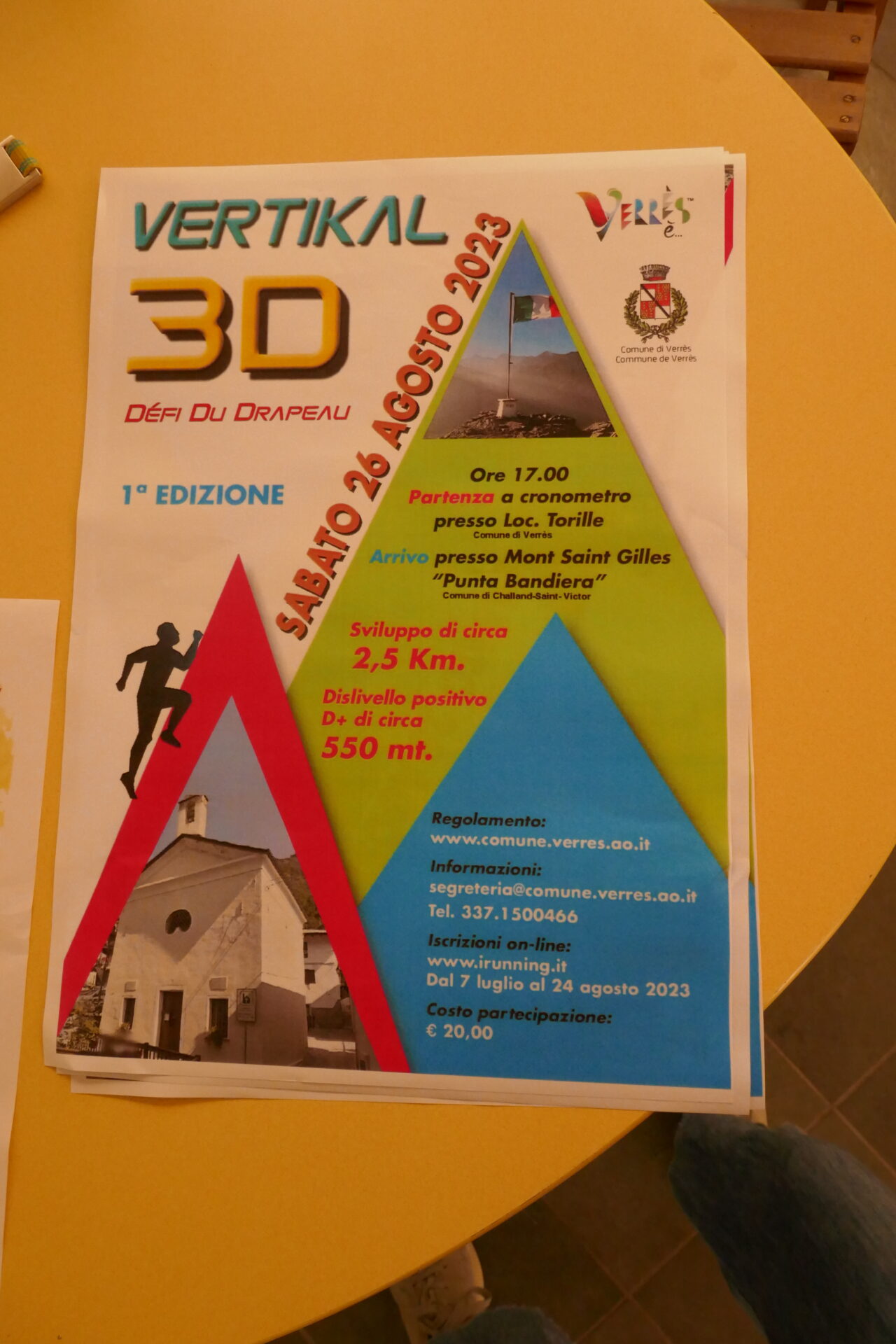 Si inizia sabato 26 agosto alle 17 “con la scia lunga”, spiega subito il Sindaco, riferendosi al Vertikal 3D, una nuova gara fresca di quest’anno. E’ stata soprannominata “Défi Du Drapeau” perché partendo dalla frazione di Torille i partecipanti dovranno proprio raggiungere la bandiera in cima al Mont Saint Gilles, in località Saint-Victor.