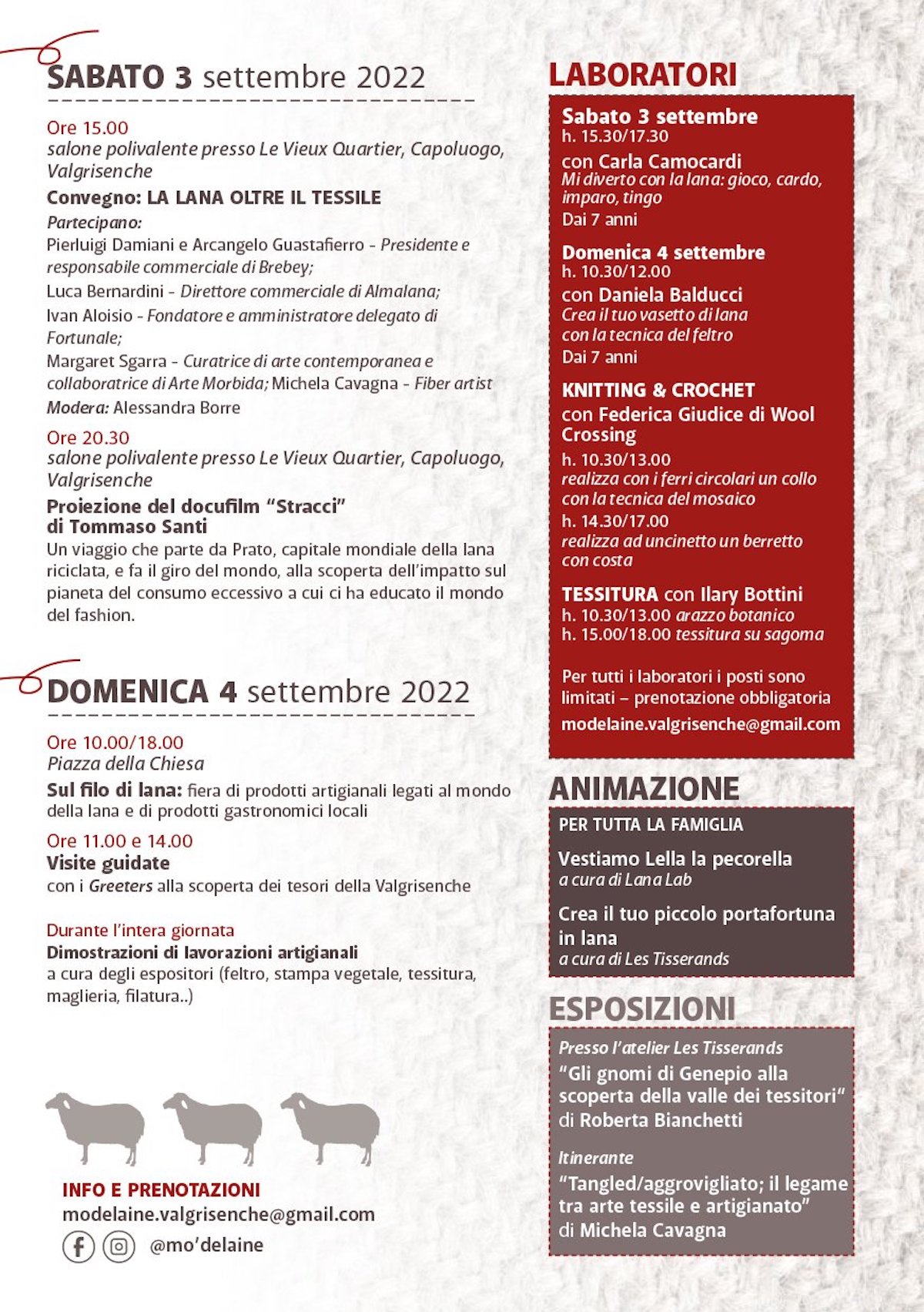 Per iscrizioni e prenotazioni scrivere a modelaine.valgrisenche@gmail.com.