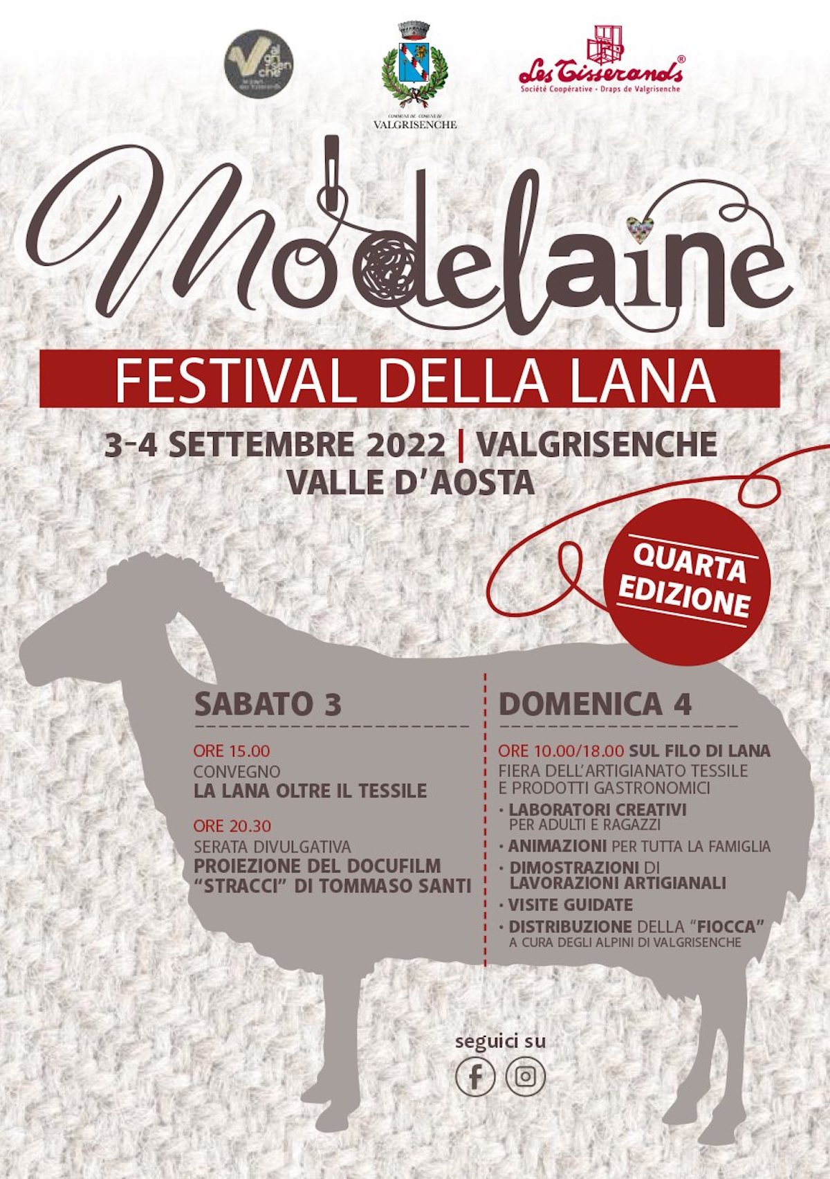 Torna, nella bellissima cornice di Valgrisenche, la quarta edizione di Mo’delaine, il festival nato dal desiderio di avvicinare il pubblico alla lana, al suo valore e le sue potenzialità, di far conoscere e comprendere la sua filiera di trasformazione di questa importante materia prima e di come si possano creare differenti prodotti e farne diversi usi.
