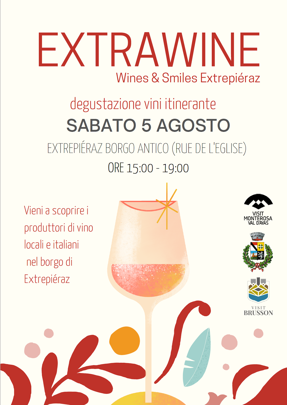 Nata dall’idea di un gruppo di amici del luogo, in collaborazione con l’Amministrazione comunale di Brusson ed il Consorzio turistico, dopo il successo dell’edizione “zero”, ecco che il caratteristico borgo si animerà con 29 produttori di vino – tutte cantine di altissima qualità – per lasciarsi trasportare in una degustazione davvero unica.