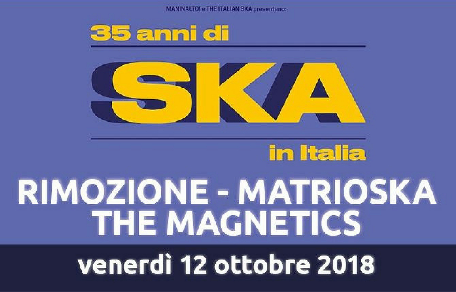 Si parte venerdì 12 ottobre alle 21 al Palatenda, quando andrà in scena “35 anni di ska”, con tre band storiche a susseguirsi sul palco: i Rimozione, i Matrioska – entrambe in pista da oltre vent’anni – e The Magnetics, con il loro sound giamaicano, fondati da Olly Riva degli Shandon.