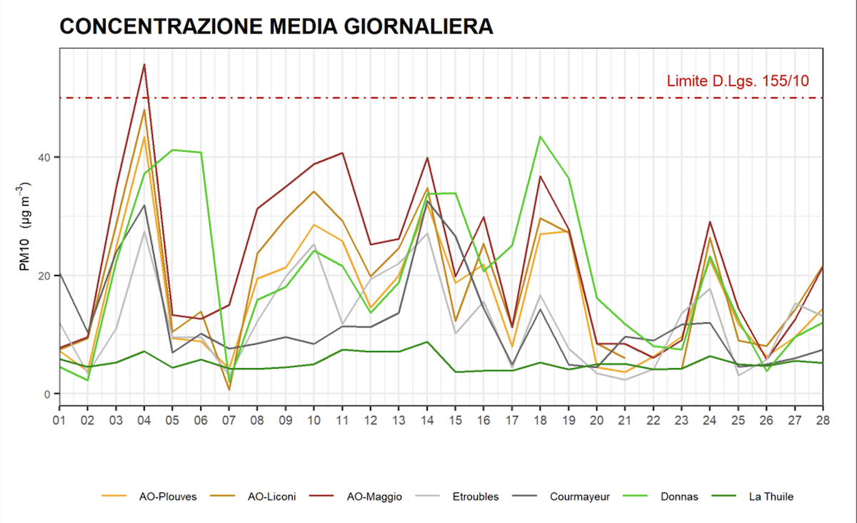 I valori medi mensili di Pm10 e di Pm2.5 nelle stazioni di Aosta – piazza Plouves, via Liconi e via Primo Maggio – sono stati all’incirca la metà del valore tipico del periodo.