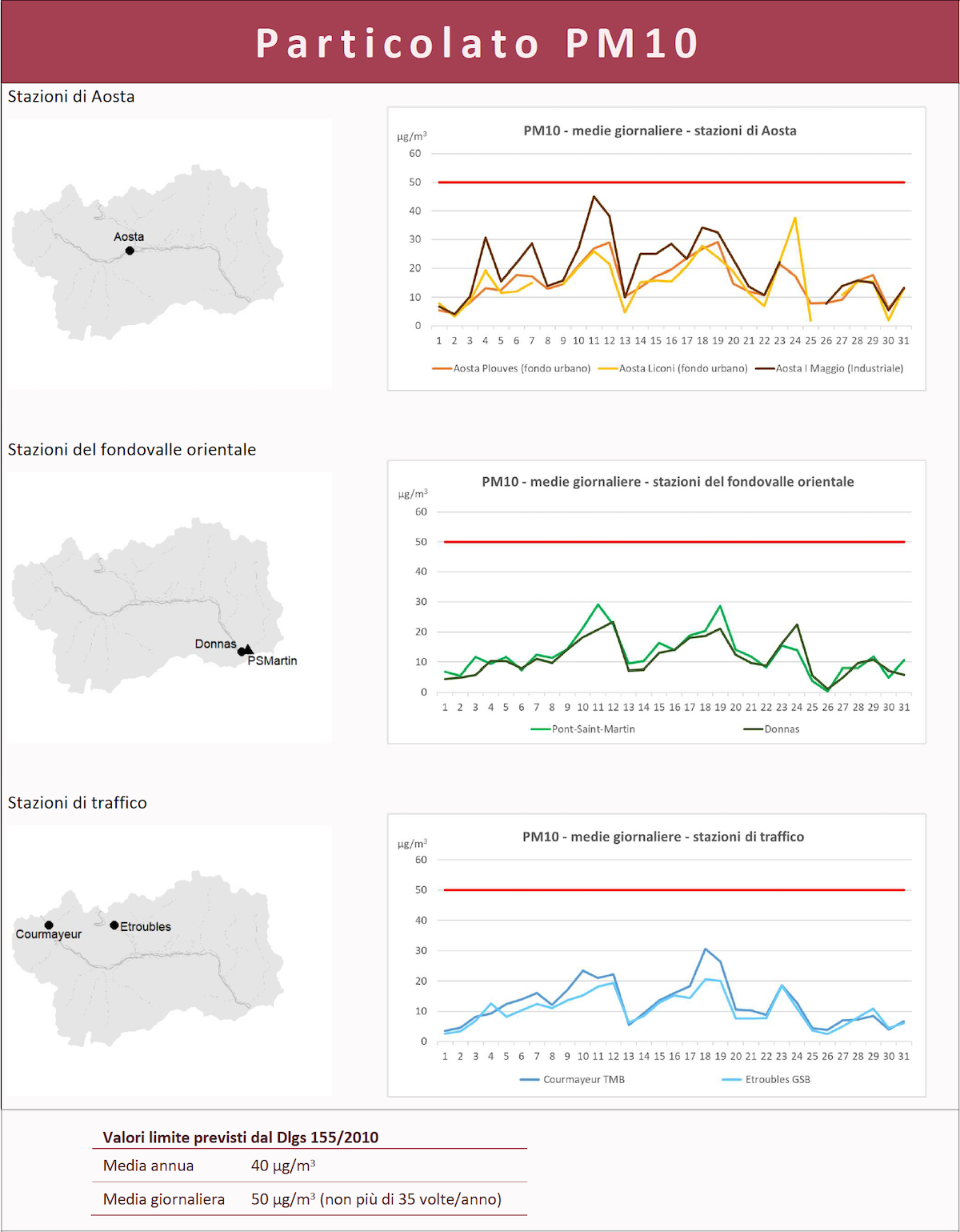 Diverso è per le polveri sottili Pm10, dove non c’è stato alcun superamento, sebbene un “picco” nella prima decade di luglio rilevato ad Aosta nella stazione di via Primo maggio e, attorno al 24 luglio, nella stazione di fondo urbano di Liconi. Tutti, ad ogni modo, ampiamente sotto il limite definito per legge.