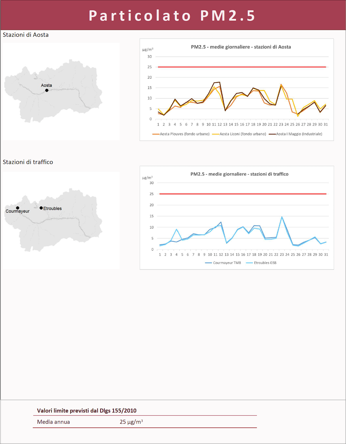 Situazione simile per i Pm2.5, per i quali la media annua rilevata – su tutte le stazioni di Aosta Plouves, Aosta Liconi, Aosta Primo maggio, Courmayeur TMB e Étroubles GSB – è inferiore al limite normativo definito in 25 µ/m3.