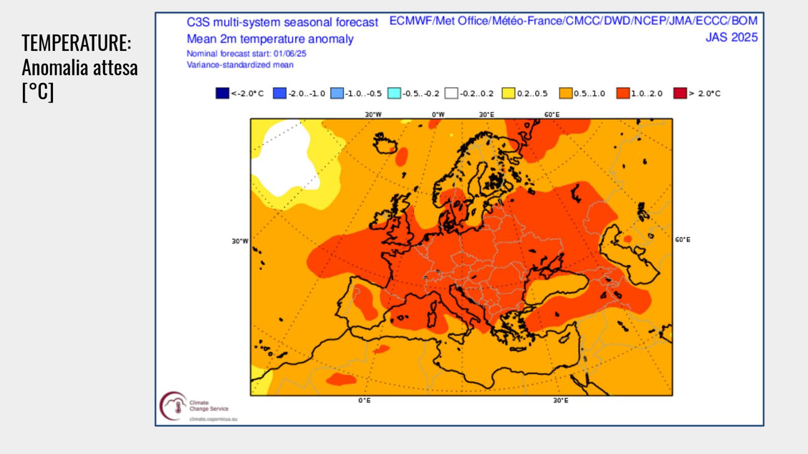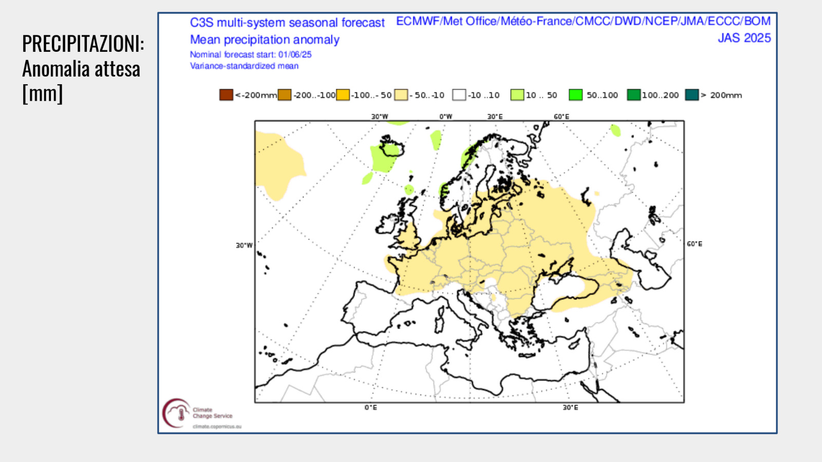 “Guardando le proiezioni sovranazionali europee”, continua Pogliotti, “i modelli indicano che nel trimestre luglio-settembre c’è una probabilità del 50% che le precipitazioni siano leggermente inferiori alla media stagionale. Si parla di un’anomalia cumulata tra i 5 e i 50 mm in meno rispetto alla media dei tre mesi. Un’anomalia, quindi, marginale”.