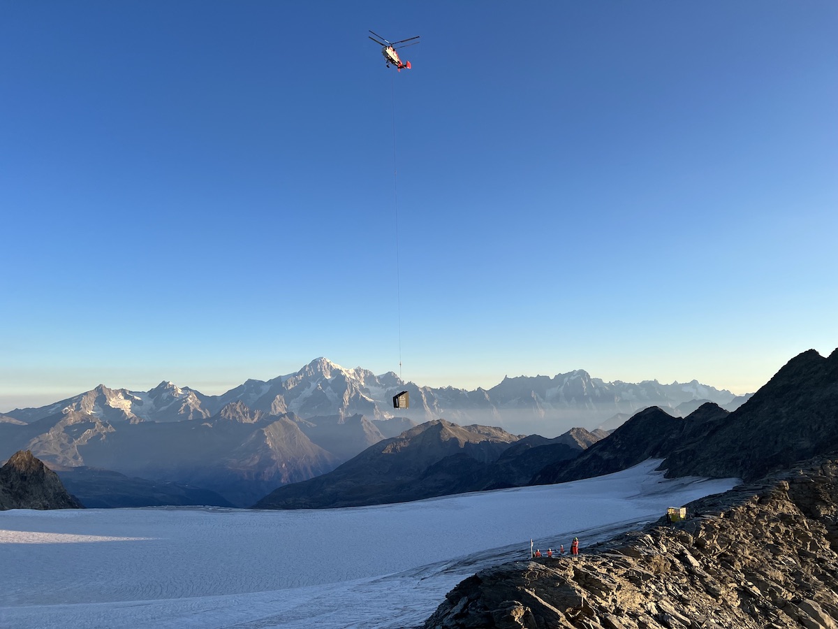 Uno speciale elicottero, arrivato espressamente dalla Svizzera, ha traportato uno dopo l’altro, i due blocchi che compongono il bivacco, e che pesano rispettivamente ben 2.6 e 2.7 tonnellate, dal campo base a La Thuile fin sul ghiacciaio, dove potrà offrire riparo a tutti gli amanti della montagna come Edoardo.