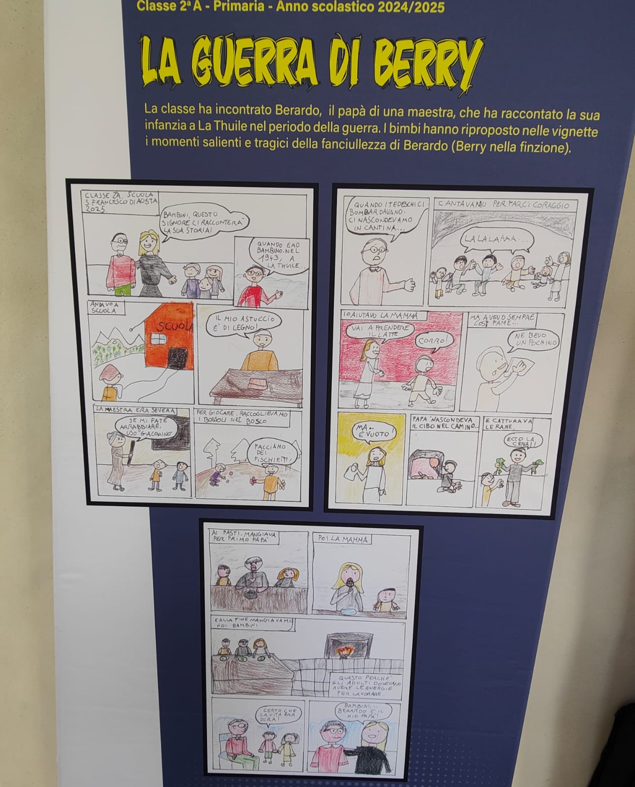 Dopo aver ascoltato alcune testimonianze di quegli anni – come quella di Berardo Zamboni che ha vissuto l’infanzia a La Thuile durante la guerra – gli studenti, guidati dalla fumettista Erika Centomo, si sono cimentati nella creazione di sei racconti a fumetti, poi stampati su dei pannelli presentati questo pomeriggio nel chiostro della Collegiata dei Santi Pietro e Orso, nel capoluogo regionale. “Mi ricordo la fame – racconta Zamboni, che oggi ha 88 anni, protagonista del fumetto “La guerra di Berry” -. Ho mangiato tante rane perché mio papà, che era un antifascista e per questo era mal visto, quando usciva dalle miniere della Cogne, dove lavorava, le trovava lungo i ruscelli e ne portava a casa uno zaino pieno. Adesso è diventato un mangiare per ricchi, allora era dei poveri”.