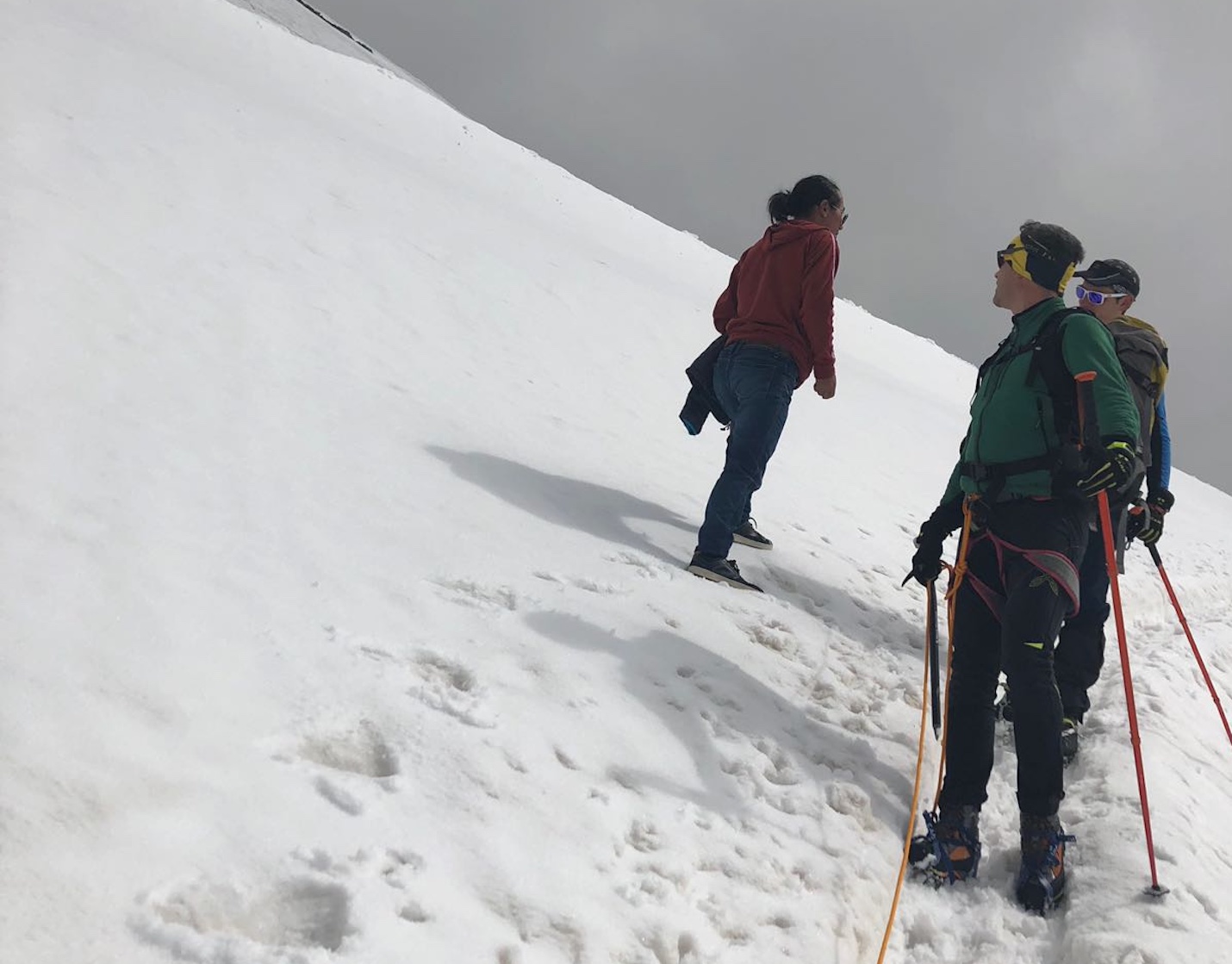 Addosso, come racconta la foto scattata da uno dei componenti della cordata, ha una felpa con cappuccio colorata, dei blue-jeans e delle sneakers basse. Abbigliamento perfetto per lo "struscio" in centro, un po’ meno per aggirarsi, in solitaria, lungo un versante montano coperto da ghiaccio. “Era asiatico, lo abbiamo fermato – continua Vicquéry – cercando di spiegargli i rischi cui andava incontro, anche perché poco sopra c’è il grande crepaccio terminale. Oltretutto, erano già le 10.30 del mattino e lo zero termico in questi giorni è alto”.