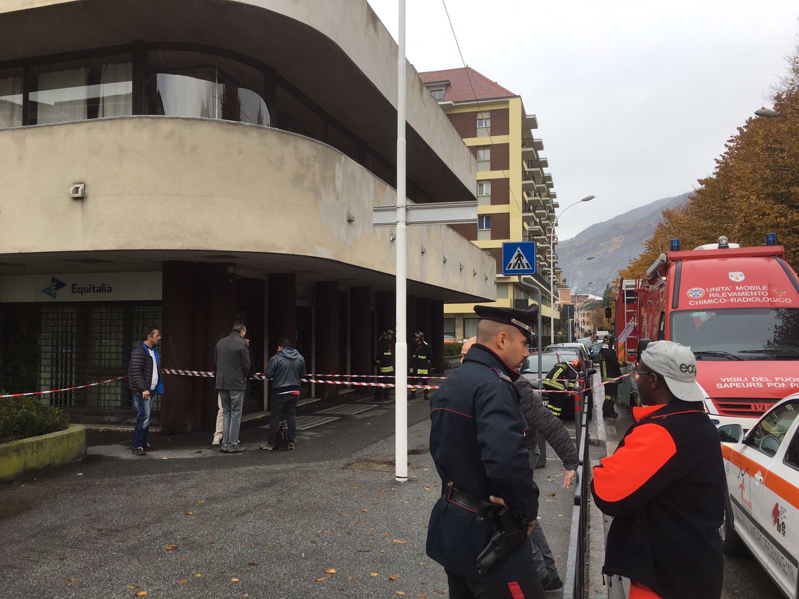 Il nucleo Nucleare Batteriologico Chimico e Radiologico dei Vigili del fuoco, assieme ai Carabinieri e alla Polizia Locale, sta intervenendo nella sede di Aosta di “Equitalia”, in via Federico Chabod.