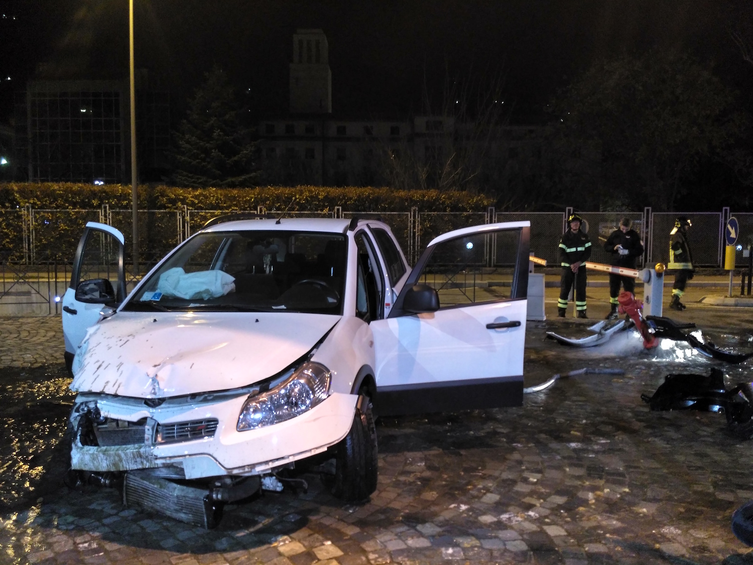 Saltando il cordolo, l’auto (guidata da un uomo che viaggiava assieme ad una ragazza) ha incontrato sulla sua traiettoria, abbattendola, una colonnina antincendio. L’impatto è stato violento, tanto che entrambi gli airbag della vettura – pesantemente danneggiata nello scontro – sono esplosi. Dalla bocchetta per gli idranti divelta è continuata a fuoriuscire acqua, allagando la sede stradale. Assieme ai militari dell’Arma, sul luogo sono intervenuti i Vigili del fuoco del comando di corso Ivrea.