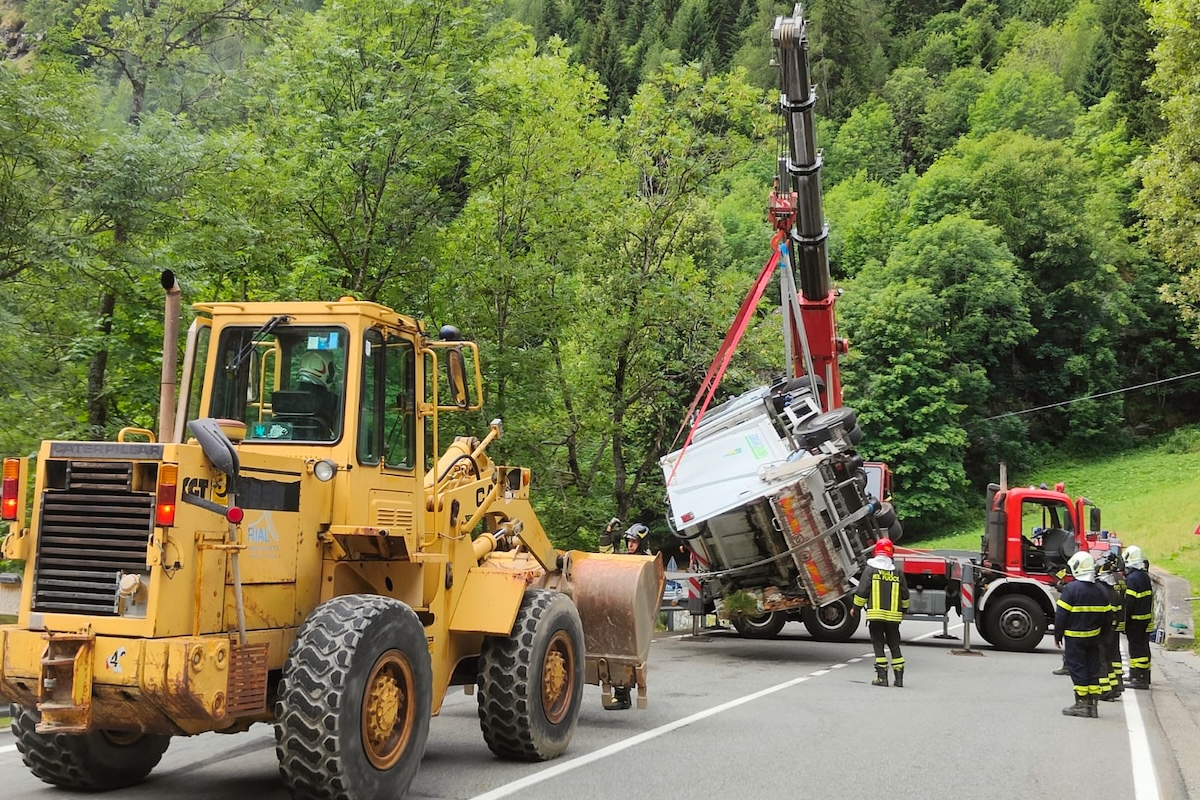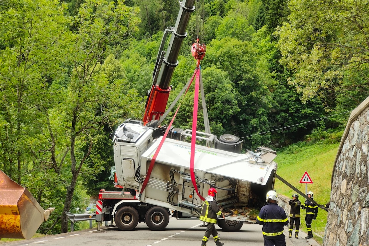 Camion si ribalta a Gressoney e invade la corsia opposta