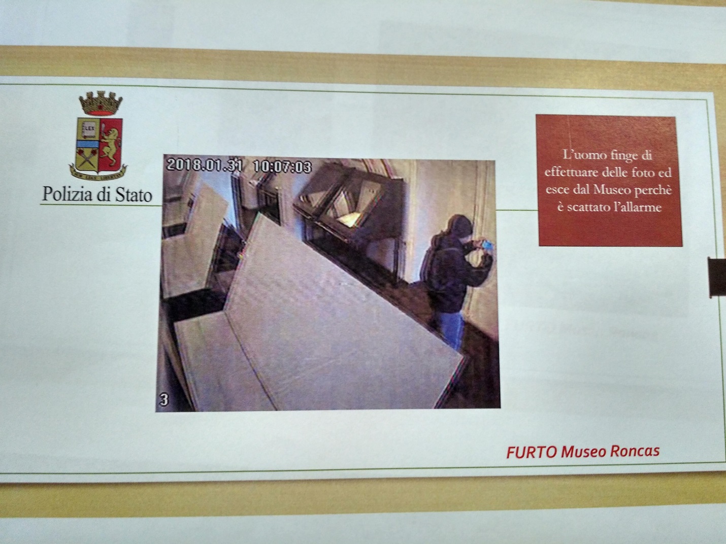 L'indagine si è sviluppata a partire dalle immagini delle telecamere della struttura di piazza Roncas, perché – pur non avendo celato il volto – il ladro non ha lasciato impronte sulla teca, aperta senza toccarla, con l'aiuto di un cacciavite o di un oggetto in metallo simile. Gli inquirenti le hanno valutate di “qualità scarsa”, ma il gabinetto di Polizia scientifica le ha trattate, rendendo possibile la comparazione dei fotogrammi contenenti il volto dell'autore del furto con le banche dati dei fotosegnalati per precedenti reati. Il fatto che l'uomo entrato nel museo, e filmato mentre finge di scattare delle fotografie per sviare sospetti, avesse dei precedenti ha fatto il resto. A ciò si aggiunge pure che, quando gli agenti lo hanno trovato, era vestito come nelle immagini della videosorveglianza.