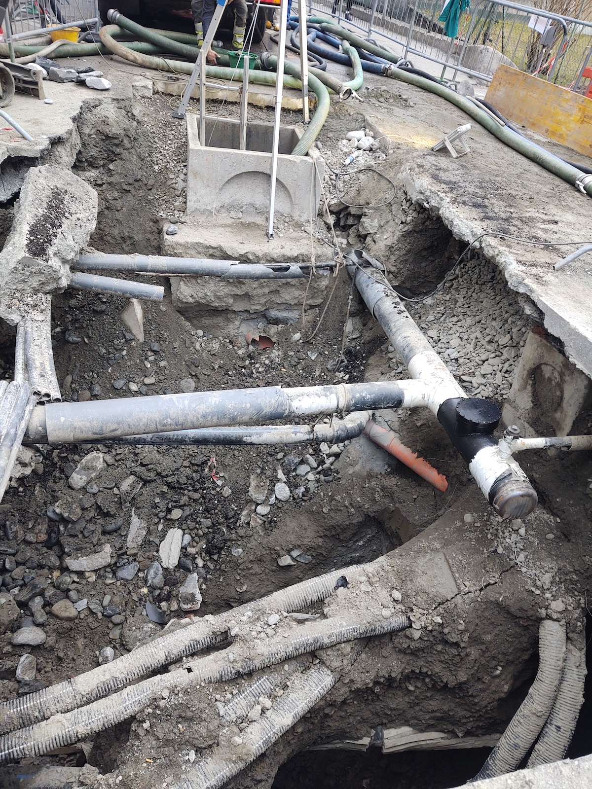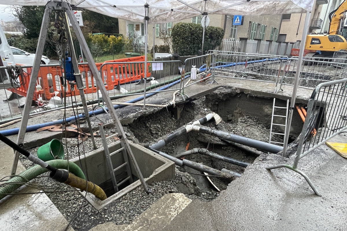 Anzitutto, si è capito – ma l’avevano capito tutti gli abitanti della zona – che il problema non era l’acquedotto: “Si credeva fosse quello, ma il problema deriva dal crollo della fognatura – spiega Luigi Vesan, dirigente tecnico della società Services des Eaux Valdôtaines –. La fognatura è a cinque, sei metri di profondità, ed è di complicata gestione. Anche perché sta sotto le linee del gas, dell’acquedotto e delle reti elettriche, tra gli altri. È stato aperto un enorme buco, è stato sostituito il tubo della fognatura sottostante e sono iniziati i lavori di pulizia della condotta”.