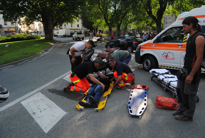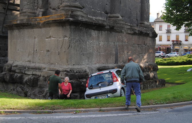 Secondo le prime informazioni una Peugeot 107, condotta da una donna, dopo essersi scontrata con una moto condotta da un 33enne valdostano, è entrata dentro la rotonda finendo la sua corsa contro il monumento storico.